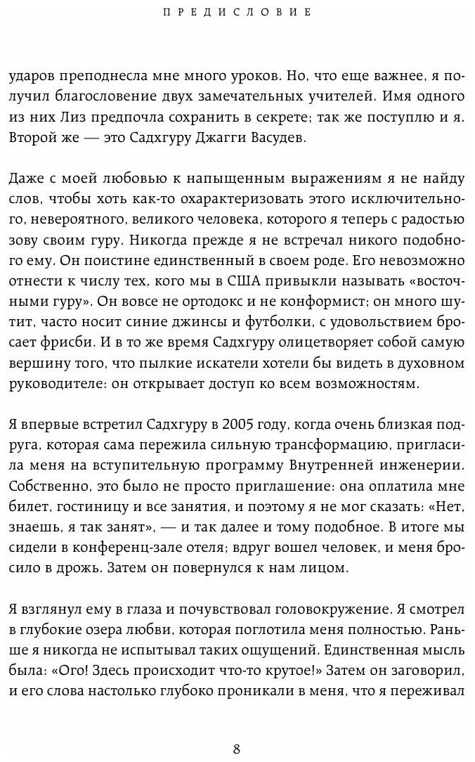 В этой книге Садхгуру раскрывается не только как учитель, но и как человек. Он опровергает стереотип восточного гуру: носит футболку и джинсы, гоняет на катере, мастерски разжигает костер и много шутит. Книга основана на личных беседах Садхгуру с американкой Шерил Симон, его ученицей. Каждый их диалог – не просто набор содержательных фраз, а глубокая беседа между искателем истины и тем, кто ее нашел.Для понимания откровений Садхгуру не нужны специальные знания. При этом, даже искушенные в духовных вопросах люди найдут здесь новые семена мудрости.Садхгуру представляет йогу не как религию или философию, а как технологию по достижению радости и благополучия, доступную каждому. С лекциями о разработанной им системе "Внутренняя инженерия" Садхгуру приглашают в ООН, Google, General Electric, университеты Лиги Плюща и т. д. В 2017 году он впервые посетил Россию по приглашению президента Сбербанка Германа Грефа: провел мастер-класс в Сбербанке и выступил на Петербургском международном экономическом форуме.