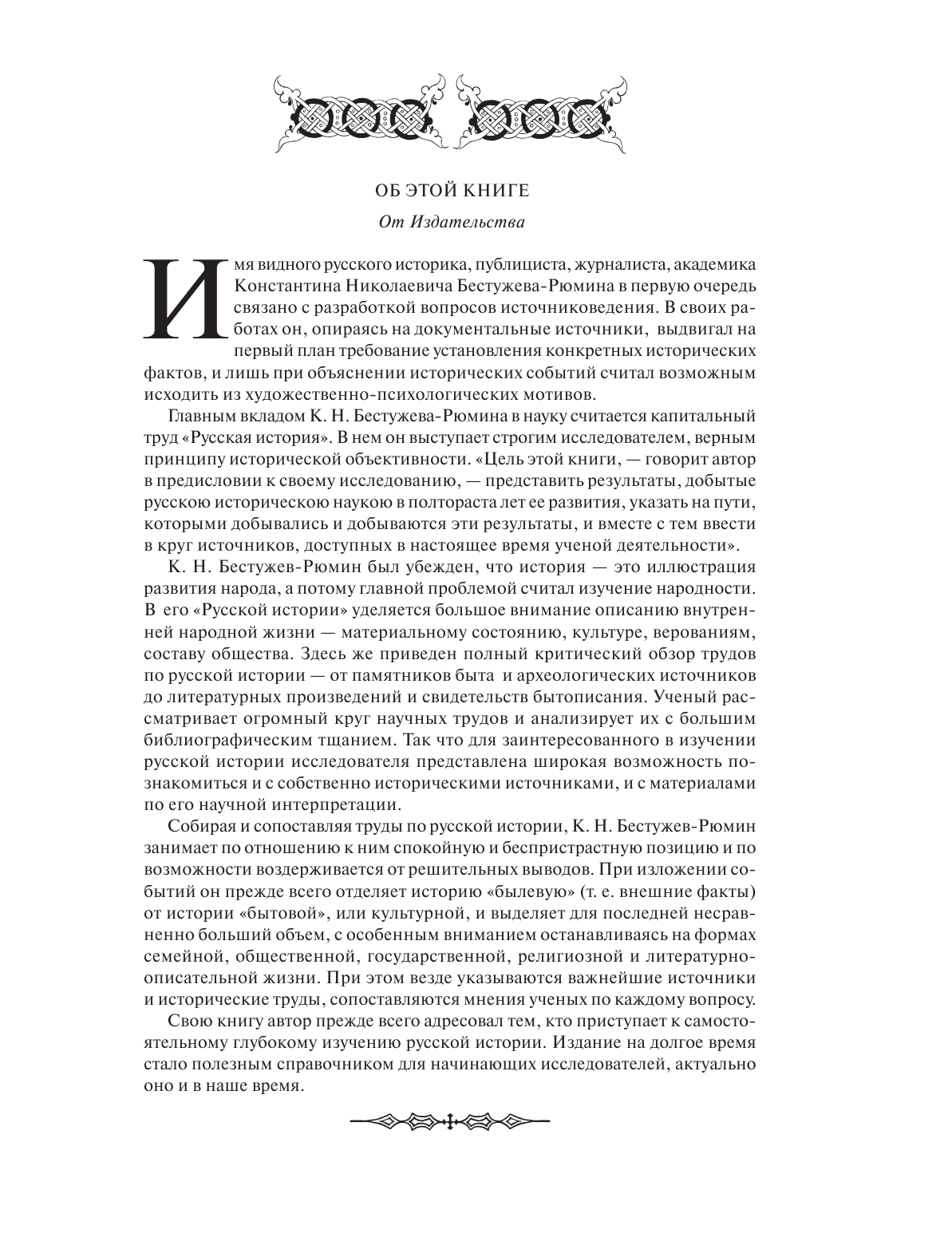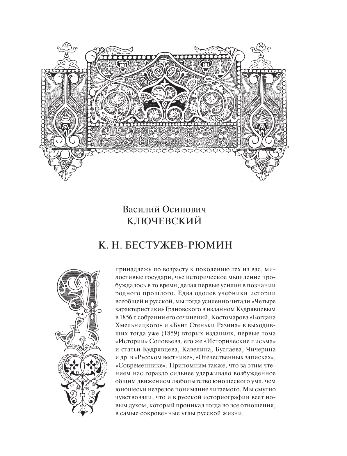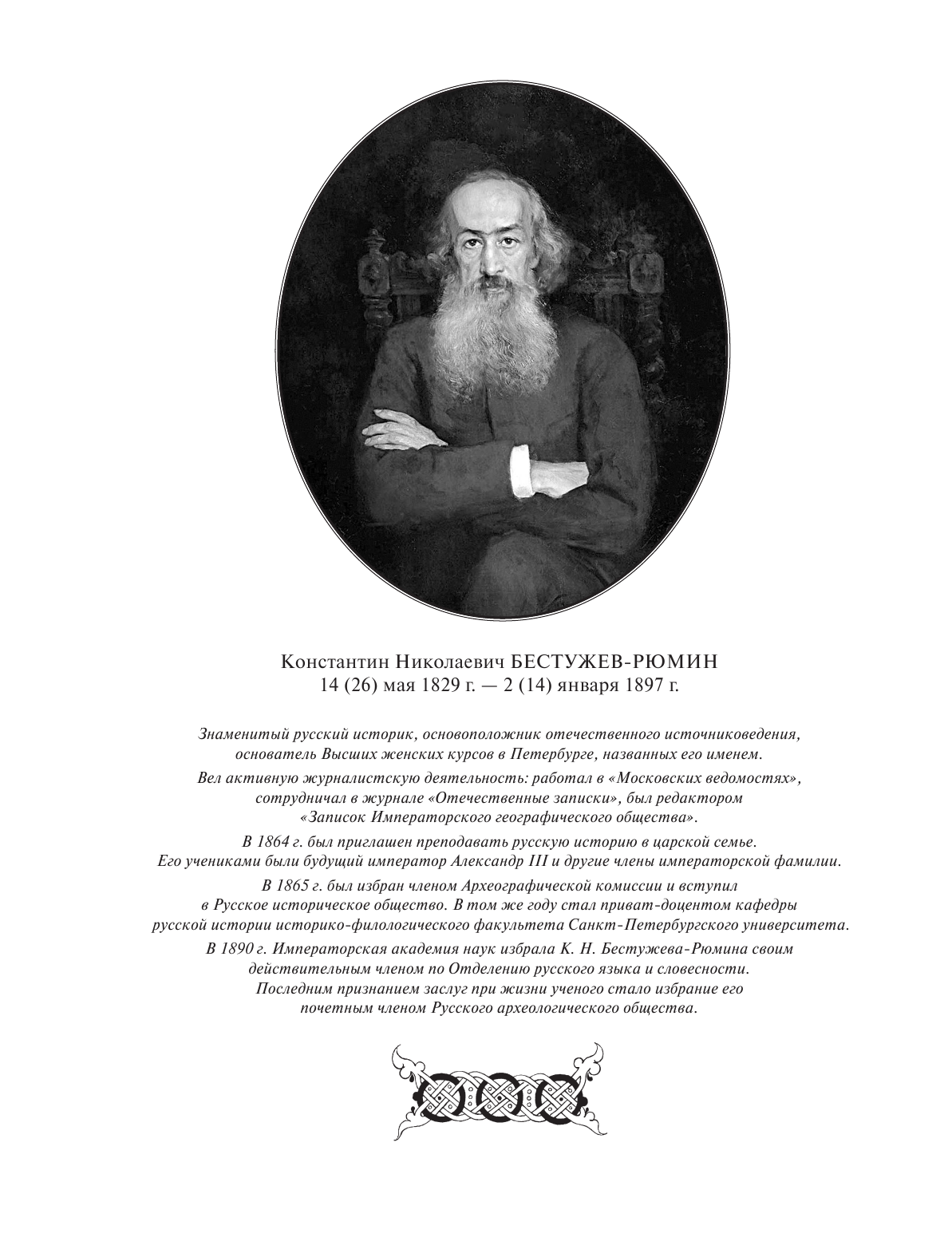 Главным вкладом в науку видного русского историка, публициста, журналиста, академика Константина Николаевича Бестужева-Рюмина (1827-1897) считается капитальный труд "Русская история". В нем он выступает строгим исследователем, верным принципу исторической объективности. Собирая и сопоставляя события русской истории, К. Н. Бестужев-Рюмин отделяет внешние факты от истории бытовой и истории культурной; ученый занимает по отношению к историческим событиям спокойную и беспристрастную позицию и по возможности воздерживается от категоричных выводов. С особенным вниманием он останавливается на формах семейной, общественной, государственной, религиозной и литературной жизни, указывает важнейшие исторические труды, сопоставляет разные мнения по каждому вопросу.