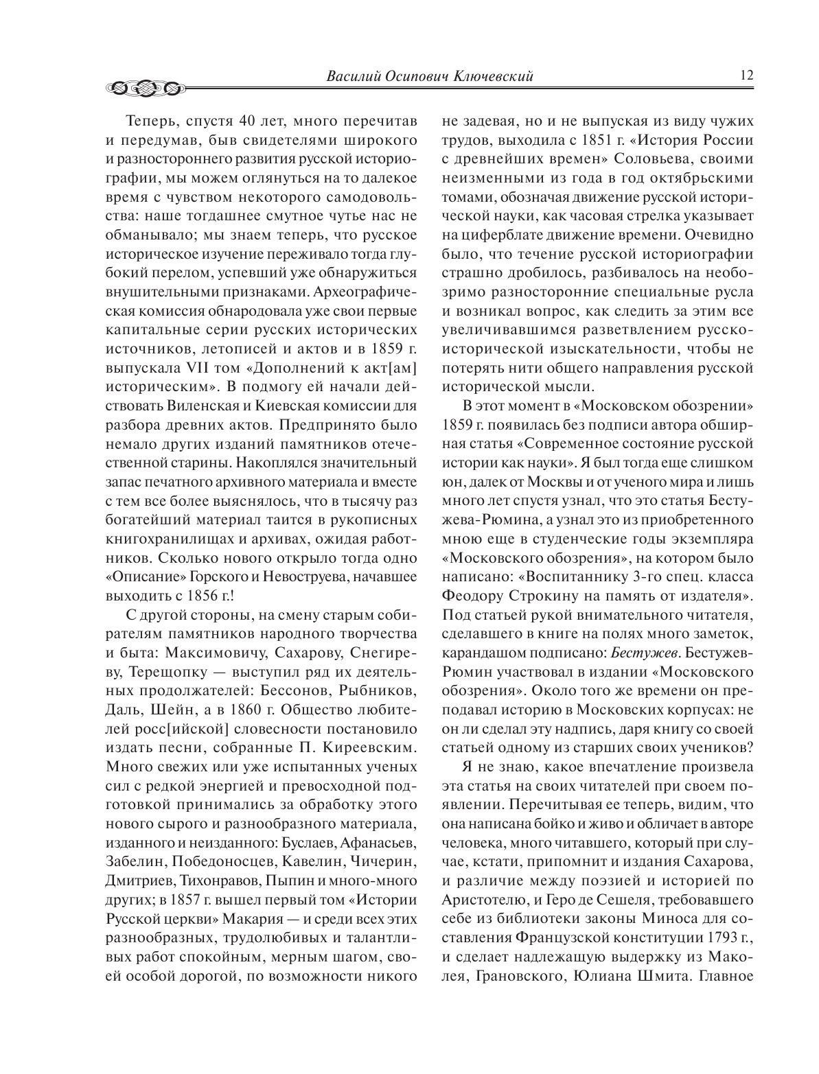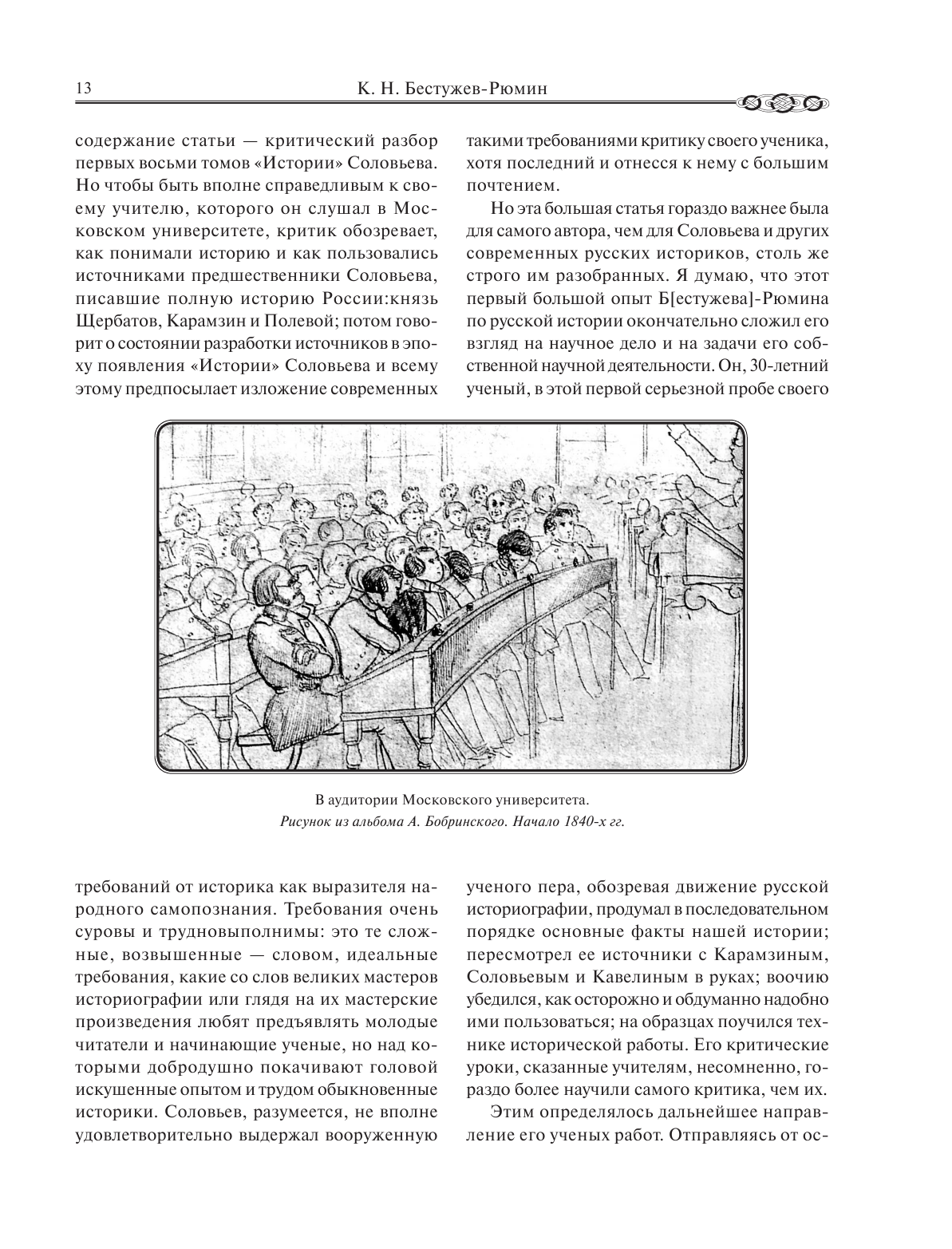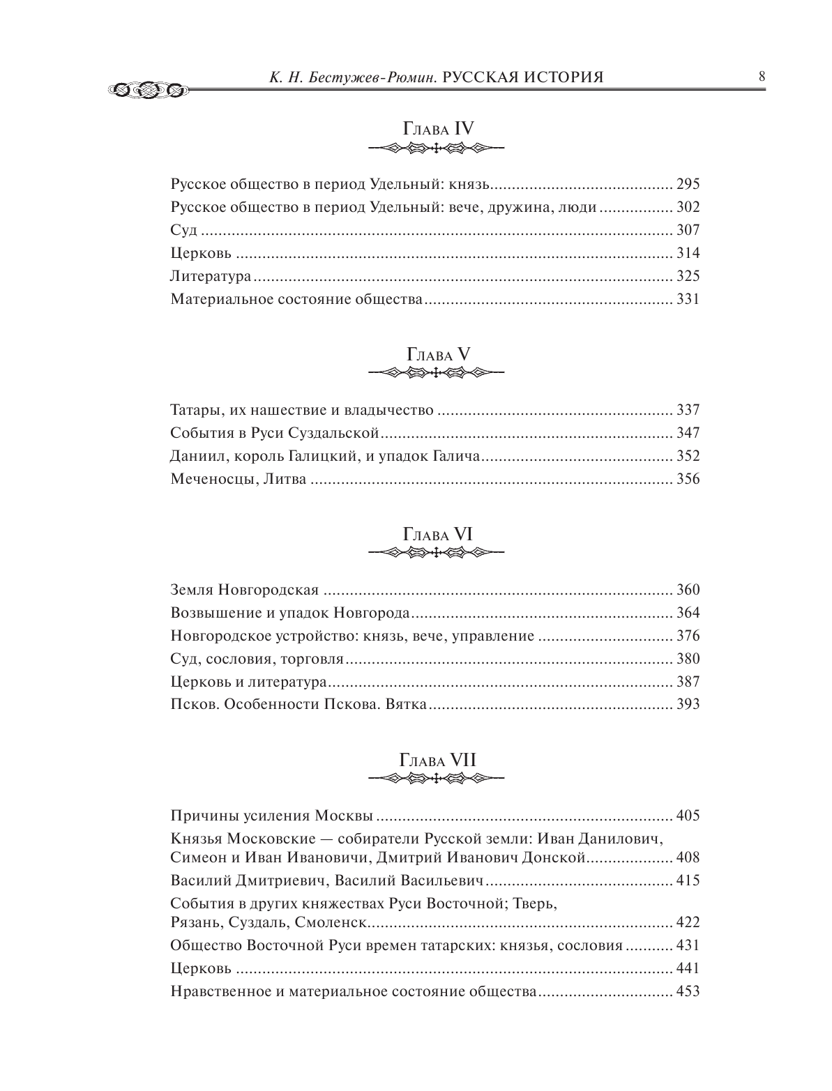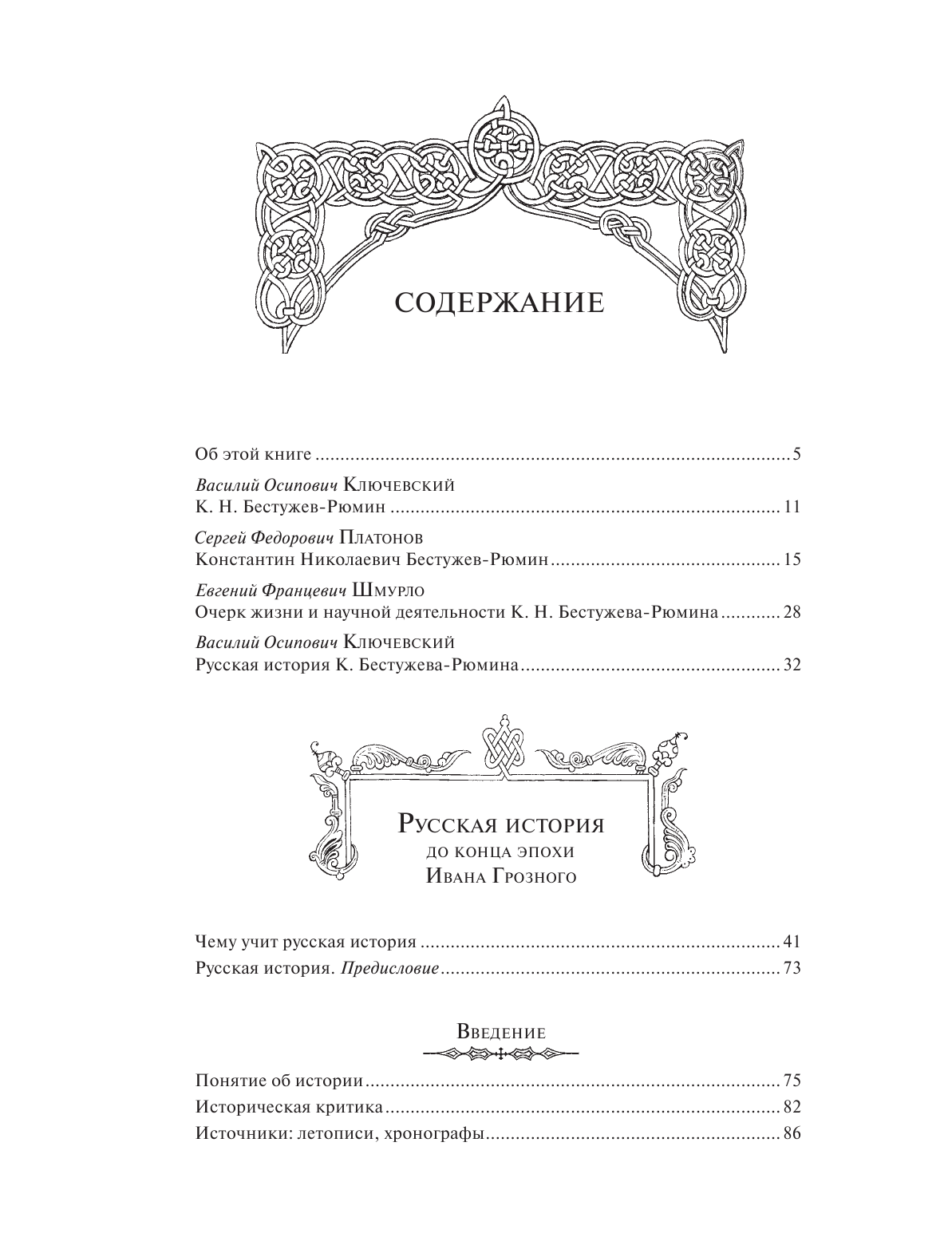 Главным вкладом в науку видного русского историка, публициста, журналиста, академика Константина Николаевича Бестужева-Рюмина (1827-1897) считается капитальный труд "Русская история". В нем он выступает строгим исследователем, верным принципу исторической объективности. Собирая и сопоставляя события русской истории, К. Н. Бестужев-Рюмин отделяет внешние факты от истории бытовой и истории культурной; ученый занимает по отношению к историческим событиям спокойную и беспристрастную позицию и по возможности воздерживается от категоричных выводов. С особенным вниманием он останавливается на формах семейной, общественной, государственной, религиозной и литературной жизни, указывает важнейшие исторические труды, сопоставляет разные мнения по каждому вопросу.