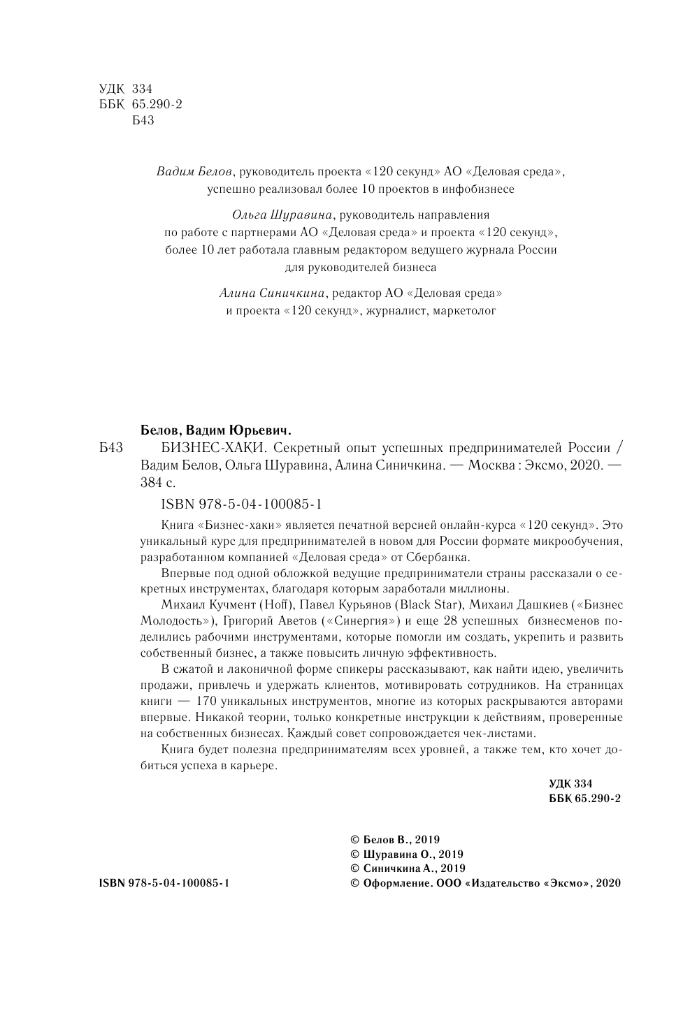 Бизнес-хаки. Секретный опыт успешных предпринимателей России (Белов В., Шуравина О., Синичкина А.); ООО "Издательство "Эксмо", 2019