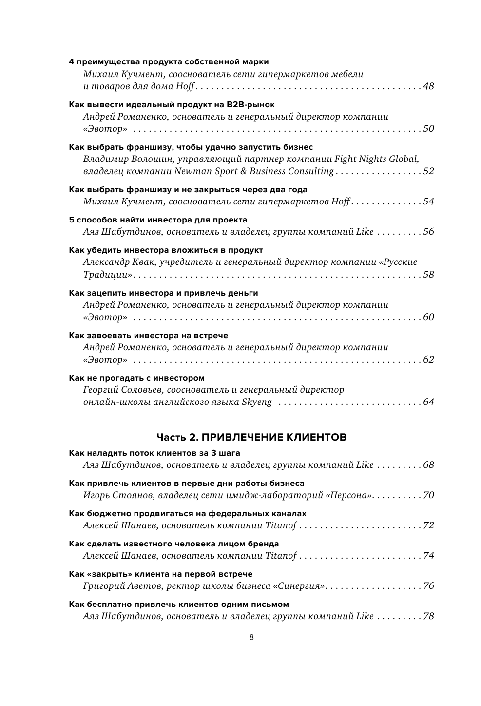 В сжатой и лаконичной форме спикеры рассказывают, как найти идею, увеличить продажи, привлечь и удержать клиентов, мотивировать сотрудников. На страницах книги - 180 уникальных инструментов, многие из которых раскрываются авторами впервые. Никакой теории, только конкретные инструкции к действиям, проверенные на собственных бизнесах. Каждый совет сопровождается чек-листами.