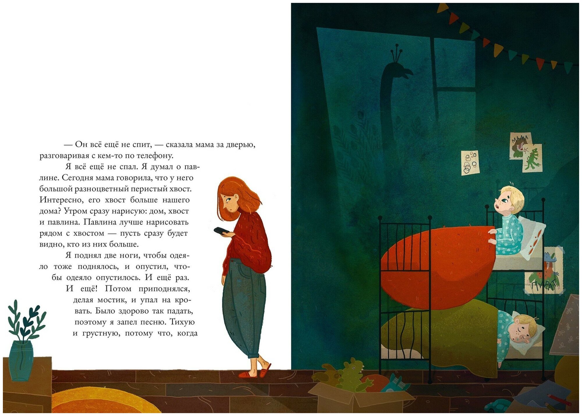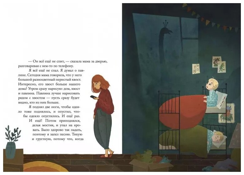 Или такой ее видят дети? Рассказчик ведь – ребенок. Это его история, его мироощущение. Его взгляд выхватывает вещи, имеющие значение. Линзы его оптики не просто симпатичные – они очень жизненные. Он будит едва заснувшего брата не из вредности, а потому что обсудить, каким будет завтрашний павлин, важнее, чем смешно дышать во сне. Он не приходит вовремя ужинать, потому что в детской надо успеть устроить зоопарк, построить парковку, потом побегать в догонялки и мало ли что еще.
