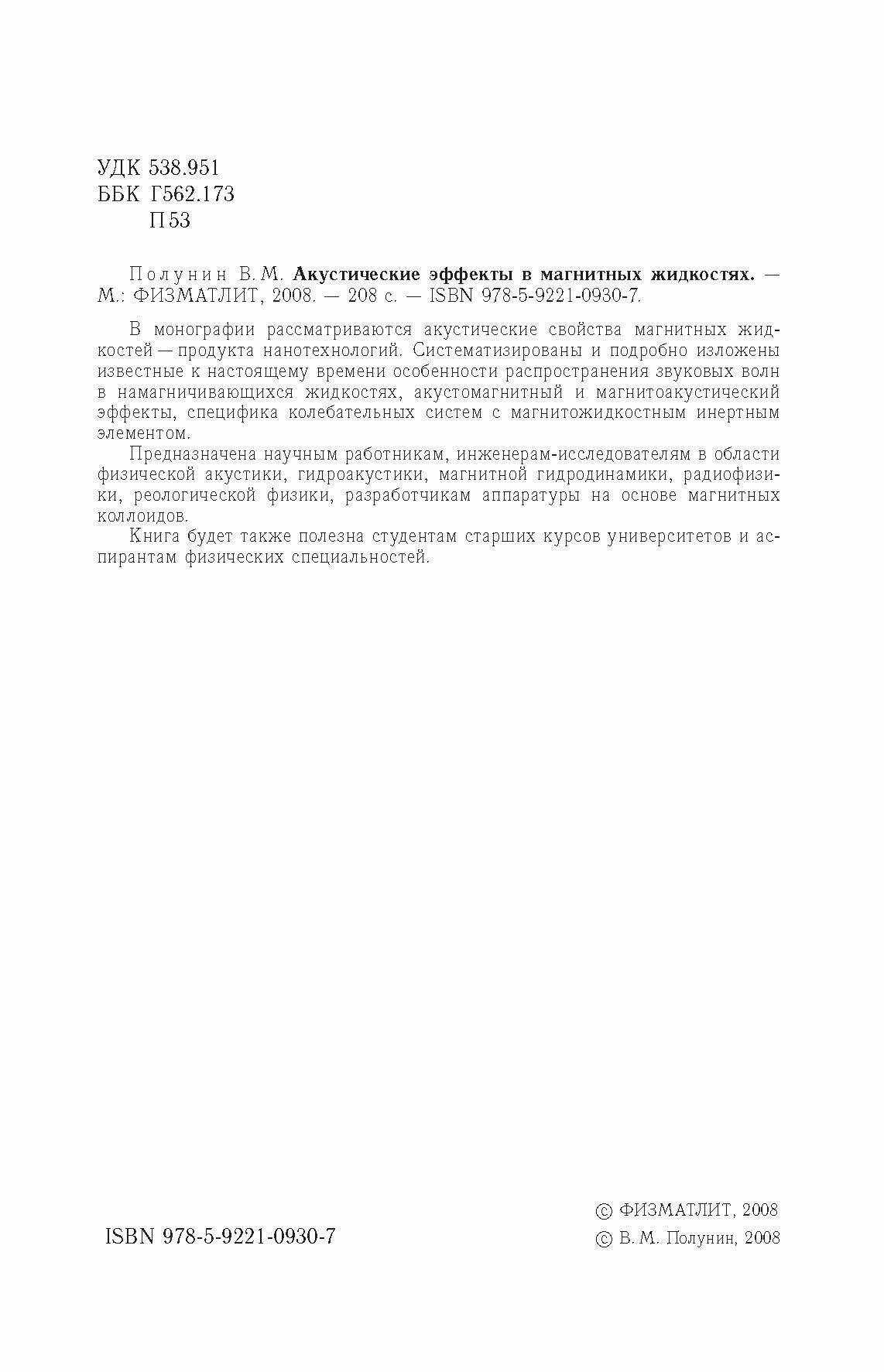 Предназначена научным работникам, инженерам-исследователям в области физической акустики, гидроакустики, магнитной гидродинамики, радиофизики, реологической физики, разработчикам аппаратуры на основе магнитных коллоидов.