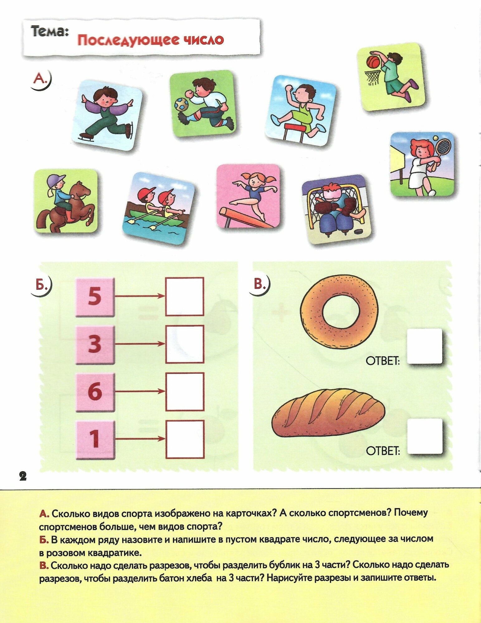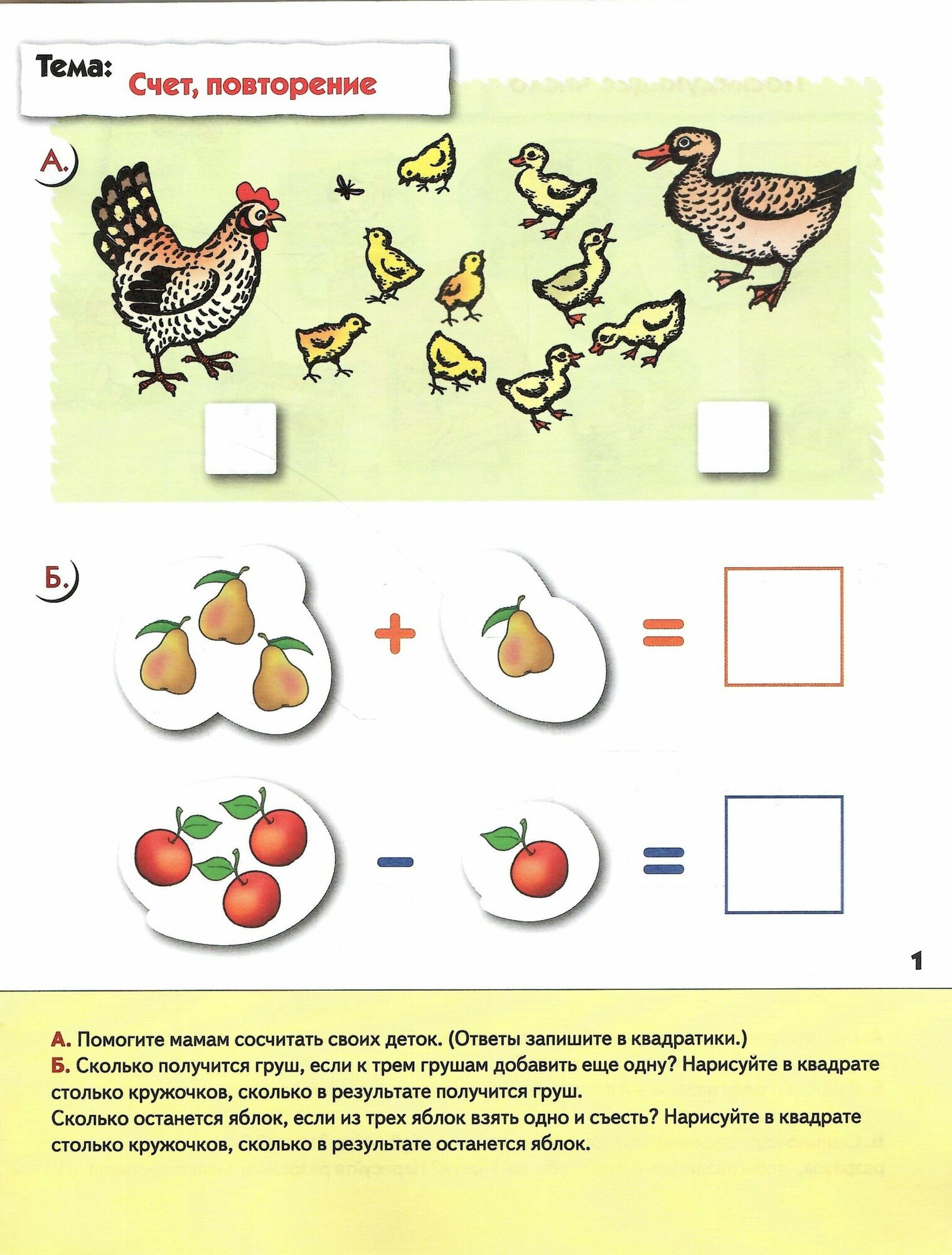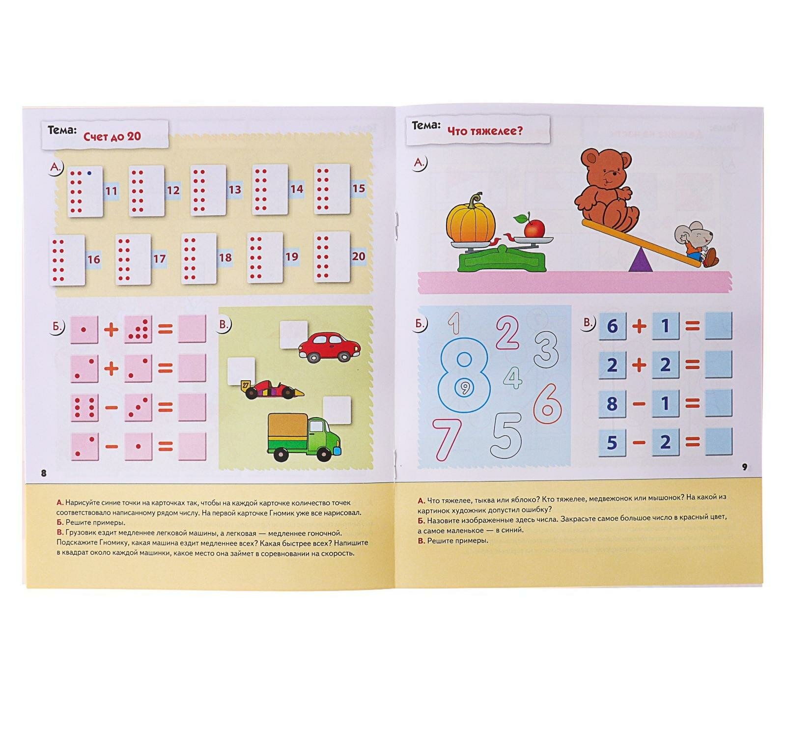 Наглядные иллюстрации помогут ребенку закрепить знания счета от 1 до 10. В пособии даются понятия «последующее число» и «предыдущее число». Дети повторяют счет до 10 и учатся считать до 20. Продолжается изучение элементарной геометрии – ребенок определяет разницу между геометрическими фигурами и телами. Усвоению азов математики помогут темы, связанные с календарем и определением времени по часам.