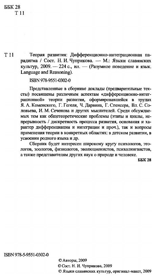 Представленные в сборнике доклады (предварительные тексты) посвящены различным аспектам "дифференционно-интеграционной" теории развития, сформировавшейся в трудах Я. А. Коменского, Г. Гегеля, Ч. Дарвина, Г. Спенсера, Вл. С. Соловьева, И. М. Сеченова и других мыслителей. Среди обсуждаемых тем как общетеоретические проблемы (этапы и циклы, непрерывность / дискретность процесса развития, основание и характер дифференциации и интеграции и проч.), так и вопросы применения теории в конкретных областях: в детском развитии, в усвоении родного языка и др. Сборник будет интересен широкому кругу психологов, этологов, зоологов, физиологов, эволюционистов, психолингвистов, а также представителям других наук о природе и человеке.