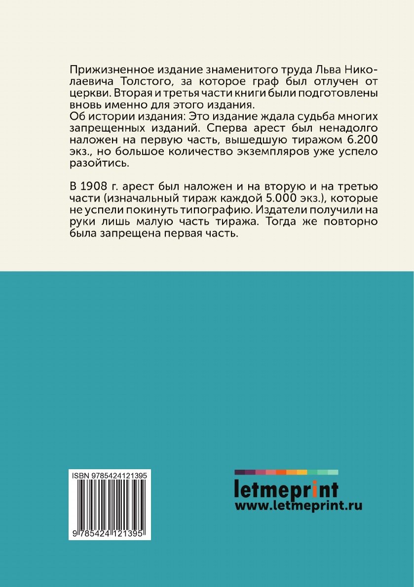 Прижизненное издание знаменитого труда Льва Николаевича Толстого, за которое граф был отлучен от церкви. Вторая и третья части книги были подготовлены вновь именно для этого издания. Об истории издания: Это издание ждала судьба многих запрещенных изданий. Сперва арест был ненадолго наложен на первую часть, вышедшую тиражом 6.200 экз., но большое количество экземпляров уже успело разойтись. В 1908 г. арест был наложен и на вторую и на третью части (изначальный тираж каждой 5.000 экз.), которые не успели покинуть типографию. Издатели получили на руки лишь малую часть тиража. Тогда же повторно была запрещена первая часть.