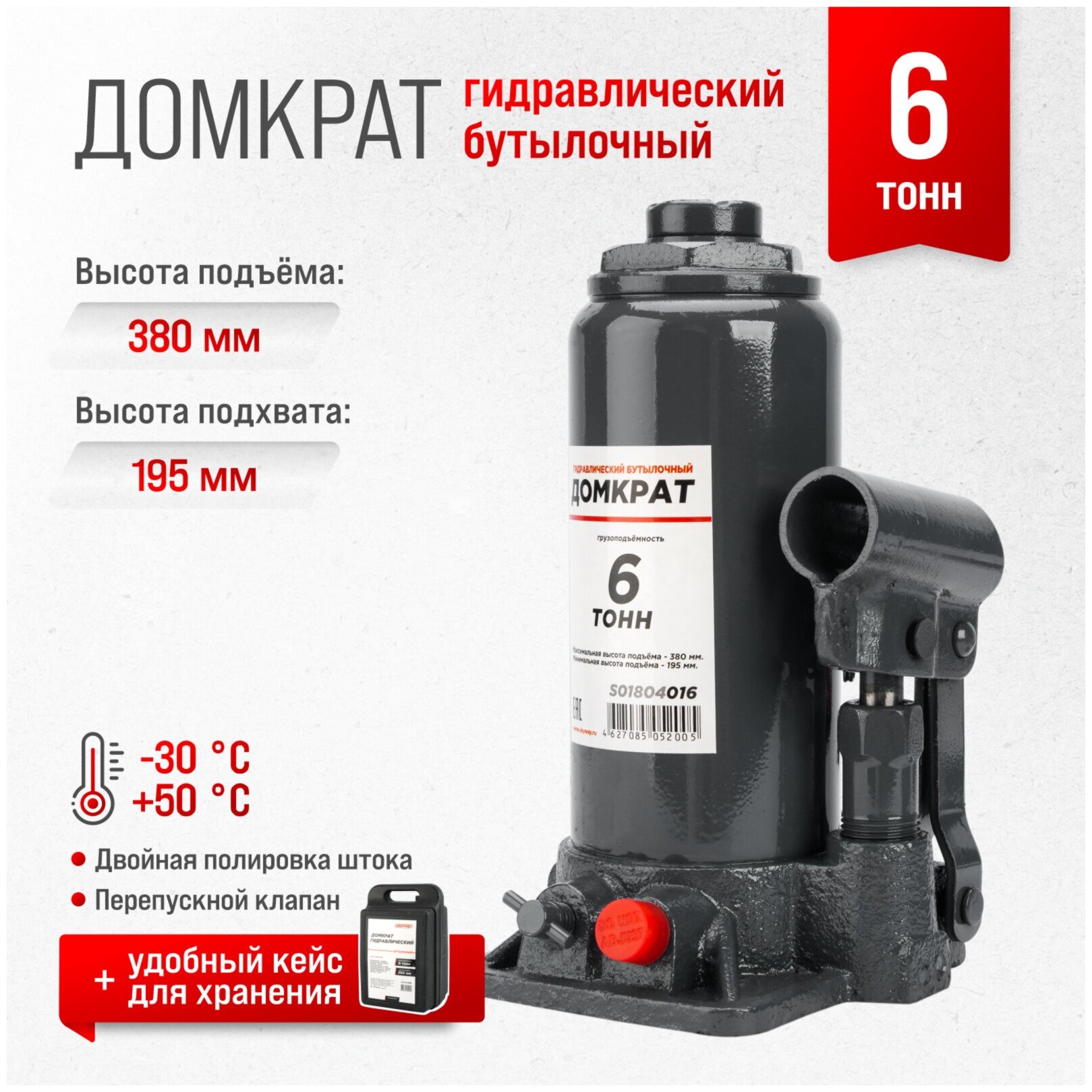 Домкрат гидравлический бутылочный 6т h 195-380мм SKYWAY с клапаном в кейсе-специальный механизм, предназначен для подъема тяжелого груза и фиксации его на требуемой высоте. Гидравлические домкраты являются наиболее эффективными, рабочее усилие создается при помощи гидравлического масла и поршня.Порядок работы.Подъем:Узким концом рукоятки домкрата следует закрыть выпускной клапан, повернув его до упора по часовой стрелке.Установите домкрат в подходящем месте под грузом или транспортным средством (см. Инструкцию по эксплуатации транспортного средства). В случае необходимости выворачивайте удлинительный винт домкрата против часовой стрелки до соприкосновения с грузом.Вставьте рукоятку в разъем домкрата и качайте до поднятия груза на необходимую высоту.Опускание:Узким концом рукоятки домкрата следует медленно открывать выпускной клапан, поворачивая против часовой стрелки.Скорость опускания зависит от скорости открытия выпускного клапана. Не открывайте выпускной клапан более, чем на один полный оборот.После полного опускания груза, верните удлинительный винт на место, вращая его по часовой стрелке, и сложите домкрат в сумку.Грузоподъемность: 6 тонны.