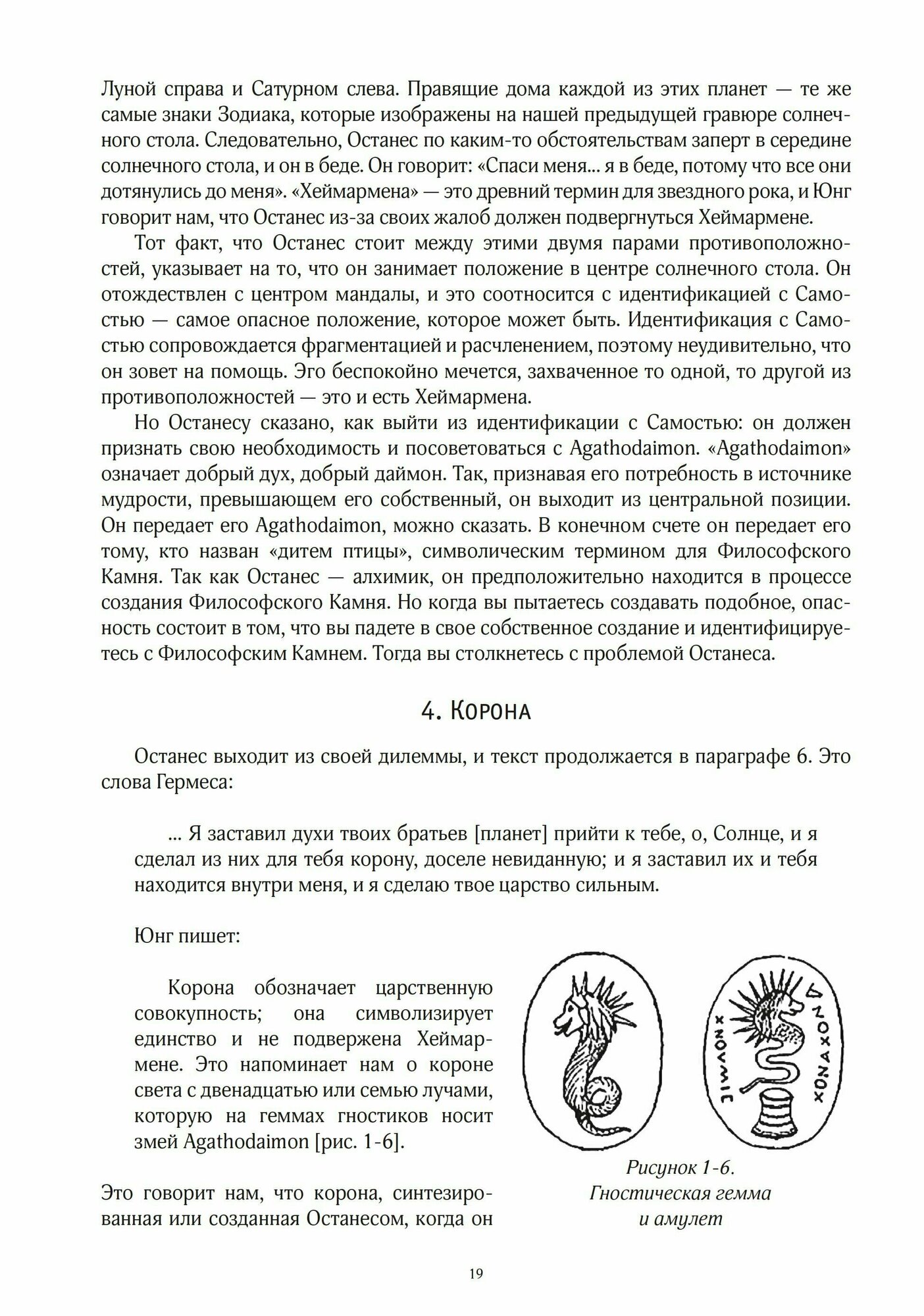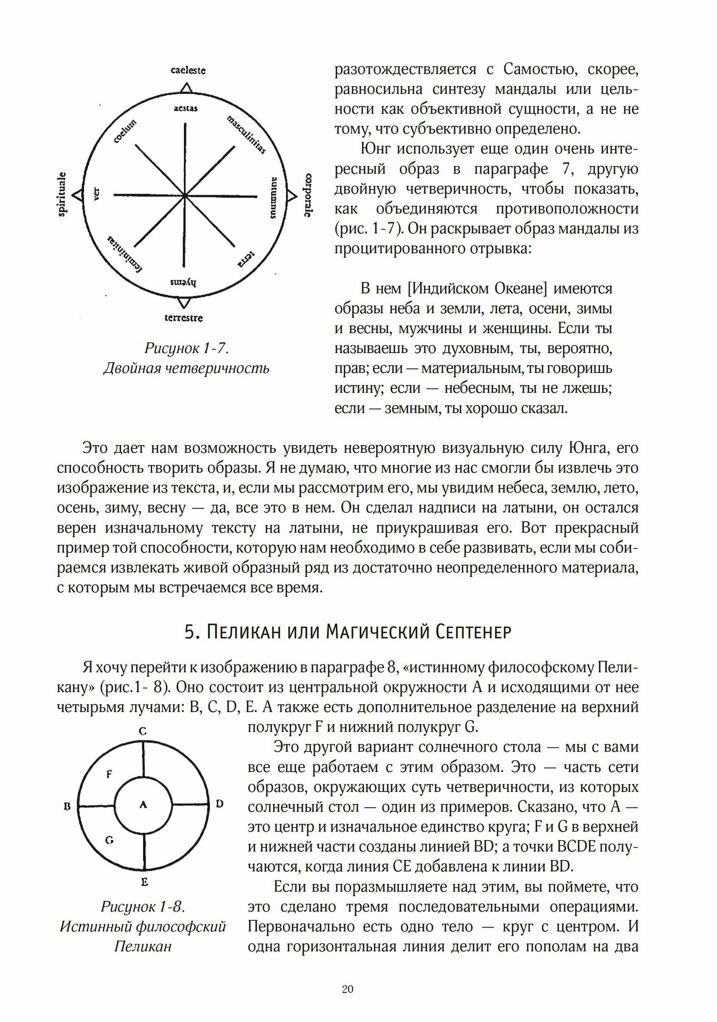 Не сказал бы, что автор раскрывает антураж алхимии в полной глубине, но есть некоторые сторонние сокровища, некоторые глубины , которые связаны с алхимией, но чья немного отстраненная (от центральных основ алхимии )местность существования не приходит в первую очередь на ум, когда собираешься найти книгу об алхимических глубинах. Глубины менее углублённые по сравнению с ( где-то в мире существующими) основами алхимии, но остающиеся глубинами и являющиеся специфичными, существующие немного в стороне. Это не об психологическом изложении , а об затрагивании вещей, которые не являются центром алхимии, вещи ( истории и символы), к которым в самой алхимии не дают центрального рассмотрения, которые существуют где-то по краям алхимии и на которые не является долгом всегда обращать внимание, но конкретно здесь рассматриваются как основные: для неискушенного схематичностью алхимии (обычно понятие знатока в любой сфере является привилегированным и основополагающим, но здесь в эссе это не имеет приоритета) человеку здесь может представиться, что данные мутно и независимо выбранные для книги образы и темы из общего тумана алхимии выстраиваются в основное лицо алхимии.