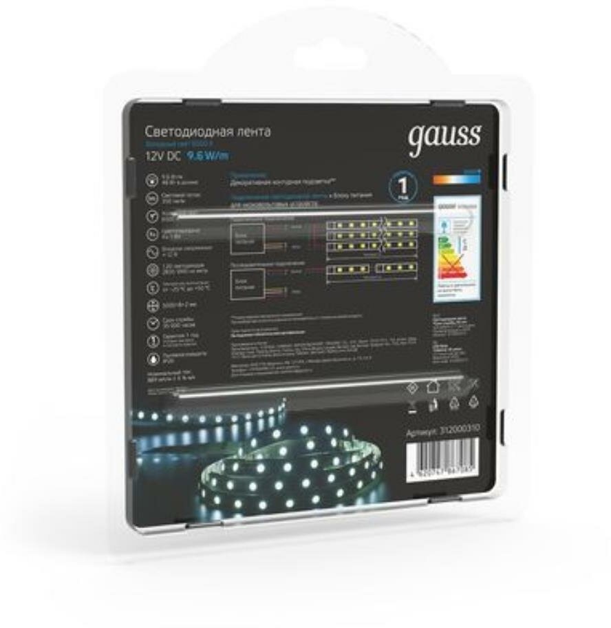 Лента светодиодная Gauss LED 312000310 предназначена для декоративной подсветки стен и потолков. Изделие очень долговечно, срок службы не менее 35000 ч. На обратной стороне ленты расположен двусторонний скотч, с помощью которого можно легко установить подсветку на любую поверхность.