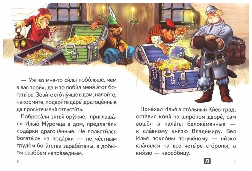 Мне очень понравилась эта книжечка. Она сделана из бумаги по типу альбомной, то есть плотной и немного фактурной. Печать очень яркая, местами рябит в глазах, буквально нет ни одного свободного места. Былина в целом, переведена и адаптирована органично. Оформление в одном стиле, никакого дискомфорта с этим нет. В принципе, все очень неплохо, 15 рублей явно немного для этой книжки.