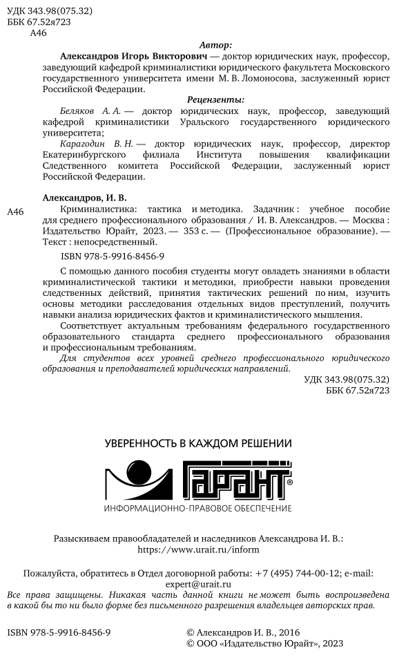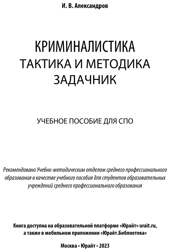 Криминалистика Тактика и методика Задачник Учебное пособие для СПО (Игорь Викторович Александров); ЮРАЙТ, 2016