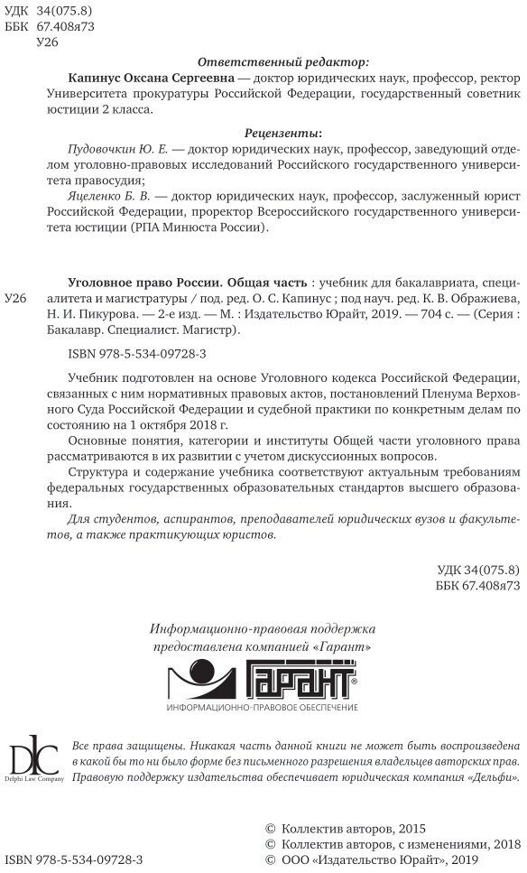 Уголовное право России Общая часть Учебник (Капинус Оксана Сергеевна; Агапов Павел Валерьевич; Жевлаков Эдуард Николаевич; Меркурьев Виктор Викторович; Наумов Анатолий Валентинович; Ображиев Константин Викторович; Пархоменко Светлана Валерьевна; Пикуров Николай Иванович; Расторопов Сергей Владимирович; Рогова Евгения Викторовна; Халиулин Александр Германович; Яни Павел Сергеевич); ЮРАЙТ, 2019