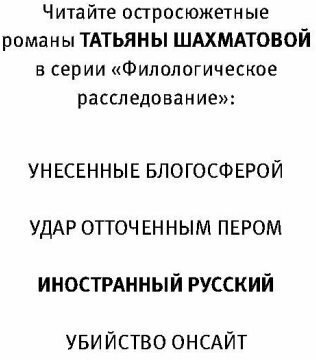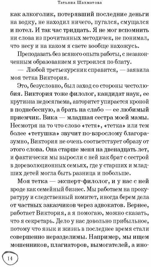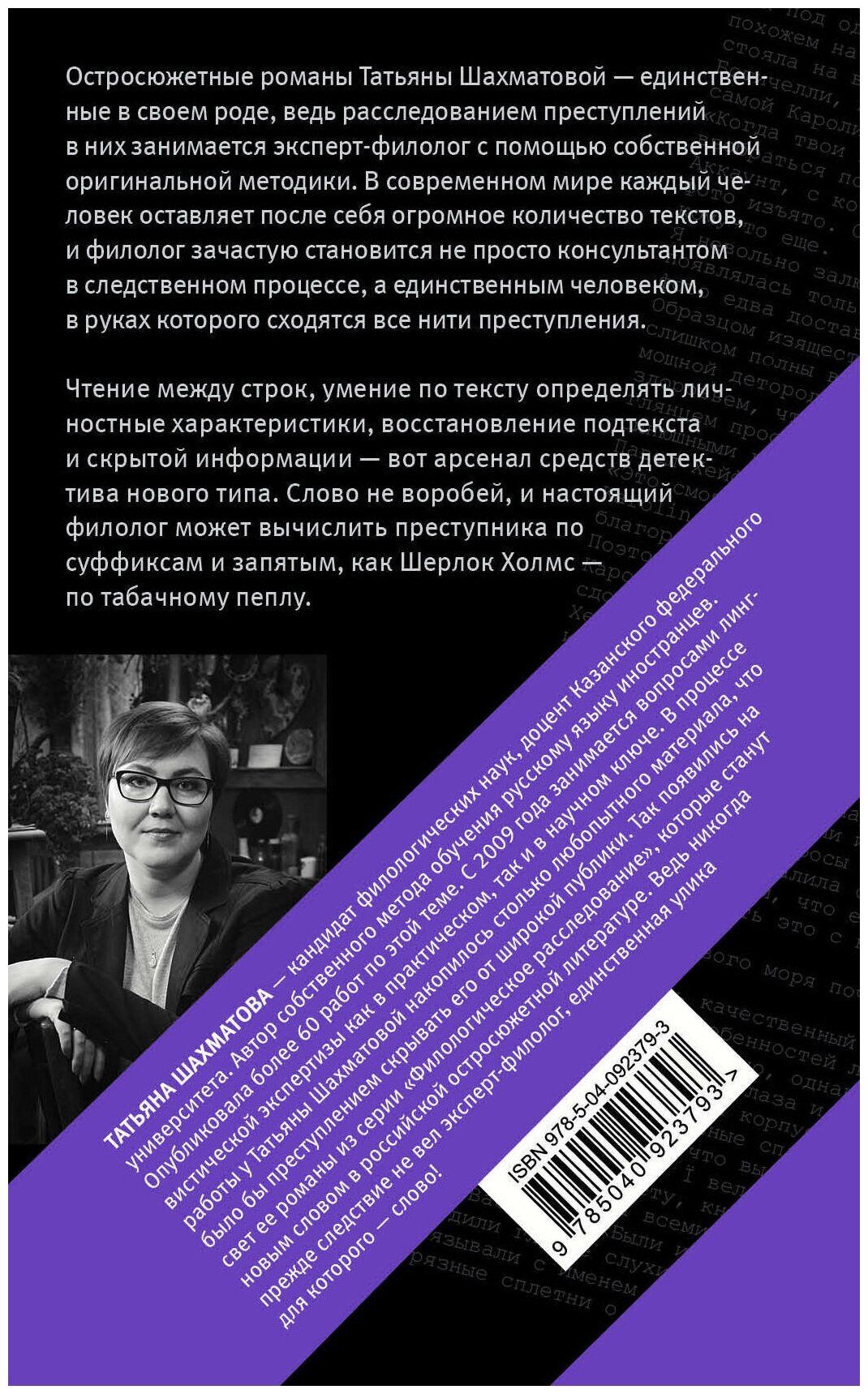 Остросюжетные романы Татьяны Шахматовой — единственные в своем роде, ведь расследованием преступлений в них занимается эксперт-филолог с помощью собственной оригинальной методики. Чтение между строк, умение по тексту определять личностные характеристики автора, восстановление подтекста и скрытой информации — вот арсенал средств детектива нового типа. Слово не воробей, и настоящий филолог может вычислить преступника по суффиксам и запятым, как Шерлок Холмс находил убийцу по табачному пеплу.