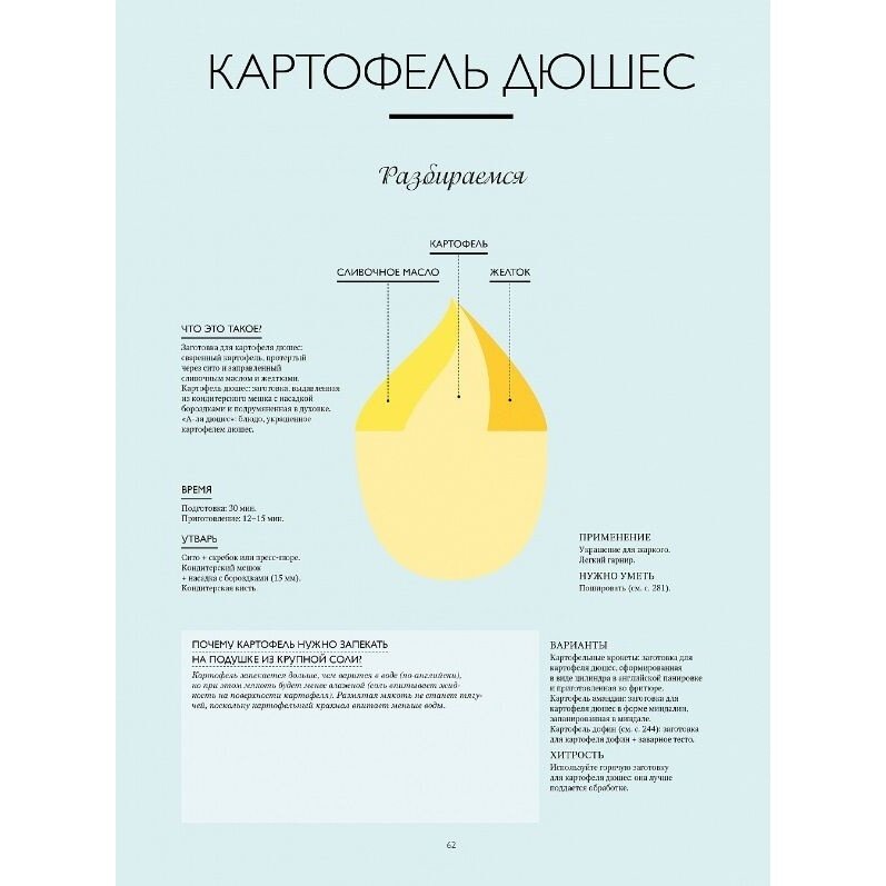 Долго меня терзали сомнения по поводу того, будет ли мне полезна данная книга, в конце концов я считаю себя довольно опытным практикующим кулинаром. Сомневалась зря. Здесь собраны знания, которые не столько научат вас чему-то новому (хотя и это тоже), сколько позволят систематизировать и упрочить знания, уже имеющиеся в вашем арсенале. К примеру, зелёное масло под кожу курицы я и раньше успешно использовала, но мне не догадаться было делать это при помощи кулинарного мешка, а здесь одни плюсы: нет риска порвать кожу, слой равномерный и аккуратный и руки чистые. Кулинария - это всегда химия и физика, с этим нужно считаться. В книге вы найдете подробные объяснения тех или иных процессов приготовления, как и на что влияют применяемые техники. Информация не исчерпывающая, но достаточная, чтобы поднять свой уровень готовки на новый уровень. От вас потребуется лишь послушание и много-много практики. Вдобавок дизайн книги очень симпатичный, рисунки-схемы весьма способствуют усвоению материала.