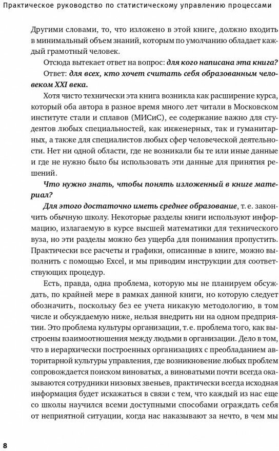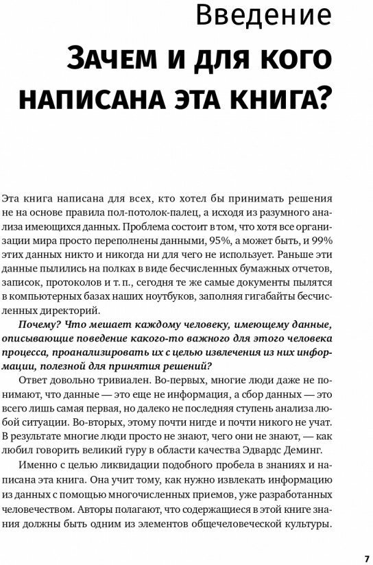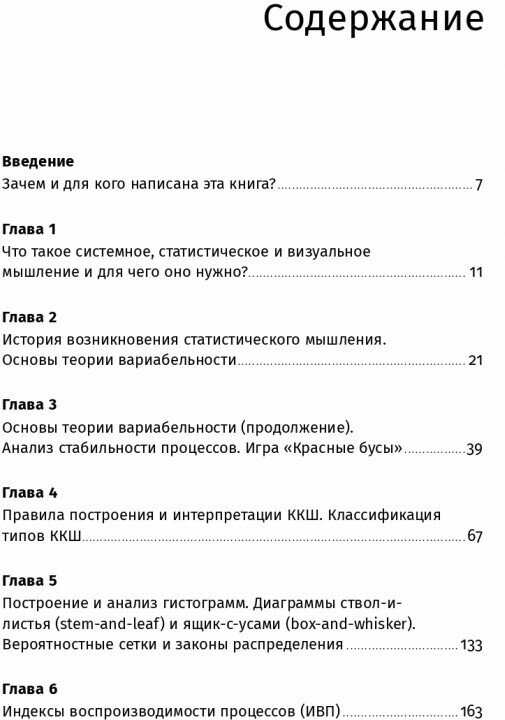 Эта книга содержит практические советы по начальному этапу анализа любого количества данных на основе системного, статистического и визуального мышления. Главным инструментом описываемого здесь подхода служат контрольные карты Шухарта с учетом их развития Демингом в сочетании с широким применением методов разведочного анализа данных, предложенного Тьюки. Эти советы основываются на многолетнем опыте консультирования компаний из разных отраслей по всему миру, а также на курсах лекций, которые авторы читали и продолжают читать студентам Московского института стали и сплавов и Московского энергетического института. Все инструменты и методы описаны на языке, доступном любому специалисту любой отрасли, а обработка данных ведется с помощью стандартного пакета Excel.