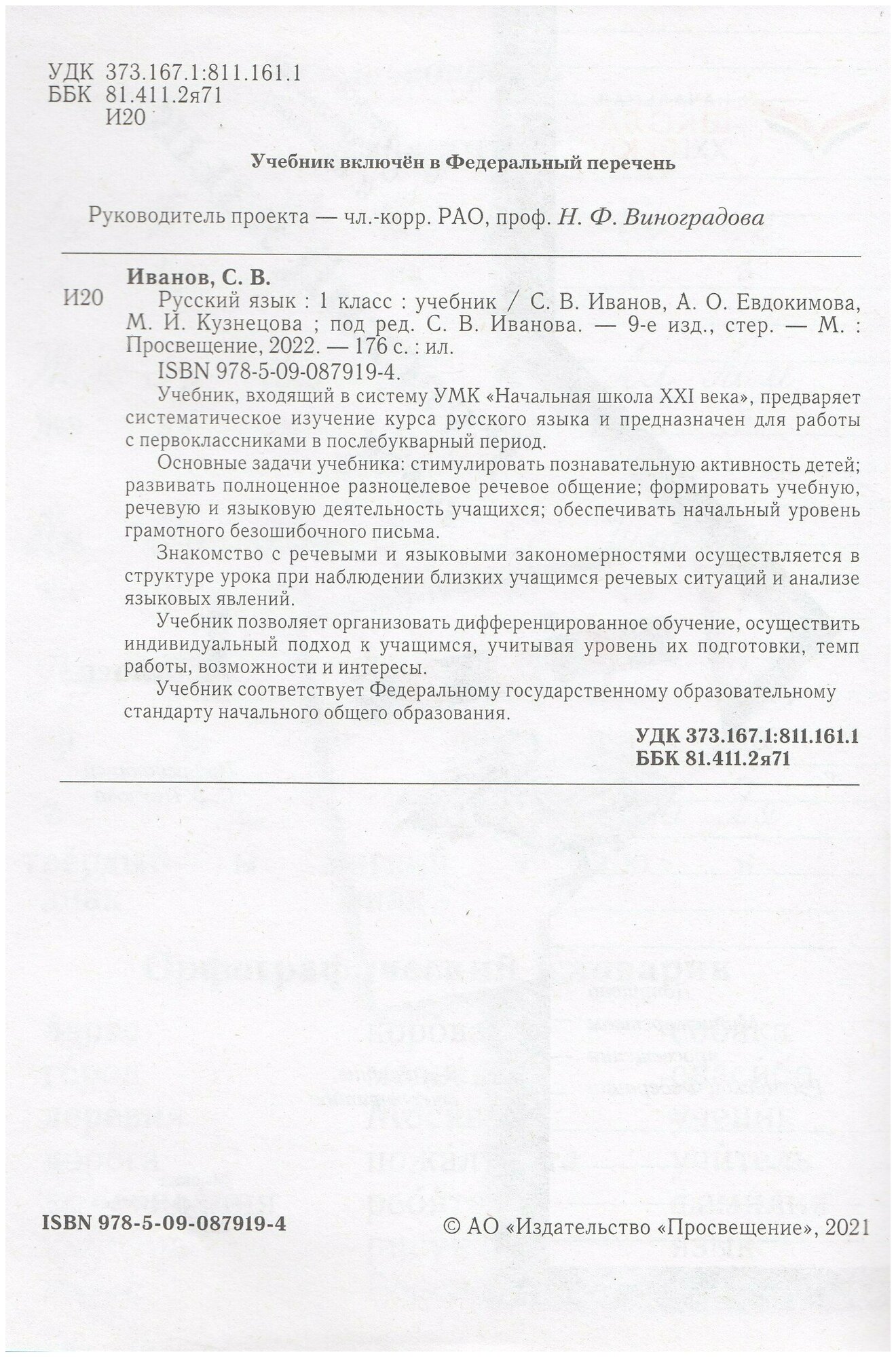 Русский язык 1 класс Учебник для учащихся общеобразовательных организаций (Иванов С.В., Евдокимова А.О., Кузнецова М.И. Под ред. Иванова С.В., Журовой Л.Е.); ДРОФА ООО, 2020