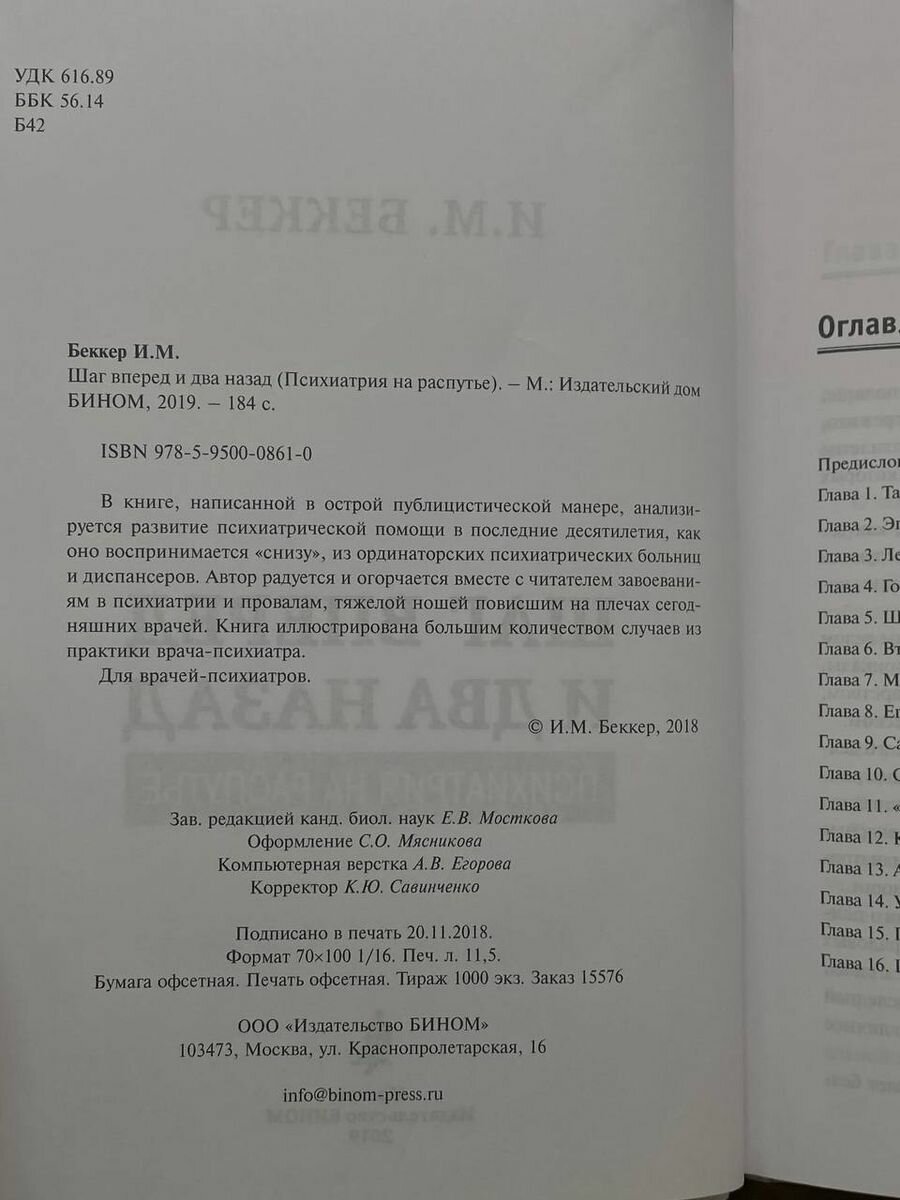 Огромное спасибо издательству БИНОМ за новую книгу замечательного врача-психиатра Исаака Михайловича Беккера. Книга будет интересна всем неравнодушным к проблемам людей с психическими расстройствами. Как и заявлено в аннотации, в книге изложена реальная ситуация в психиатрической службе в наше время. Рекомендую как начинающим врачам-психиатрам, так и врачам с опытом работы с надеждой изменить к лучшему нашу психиатрическую службу. Качество печати отличное, бумага белая, страницы прошитые.