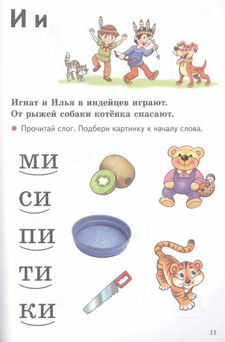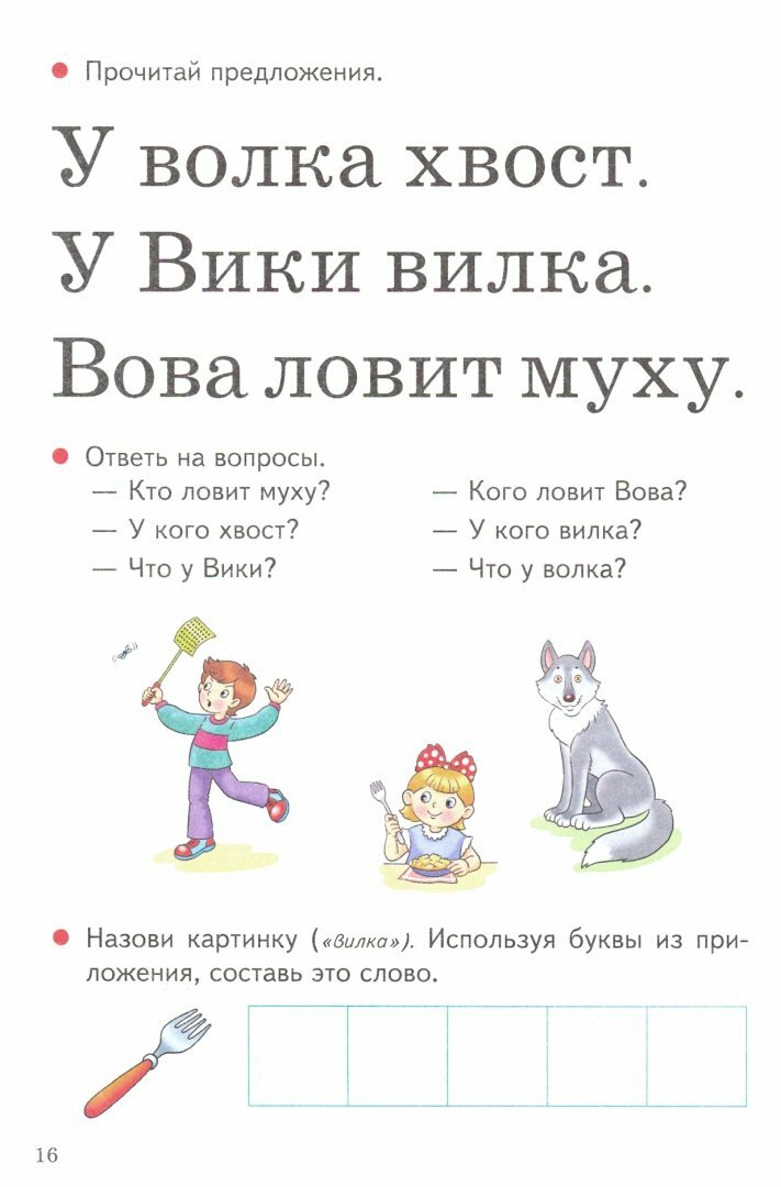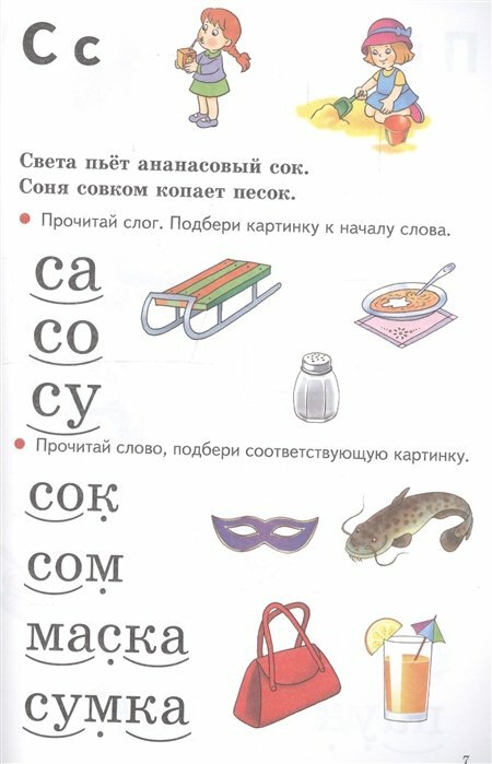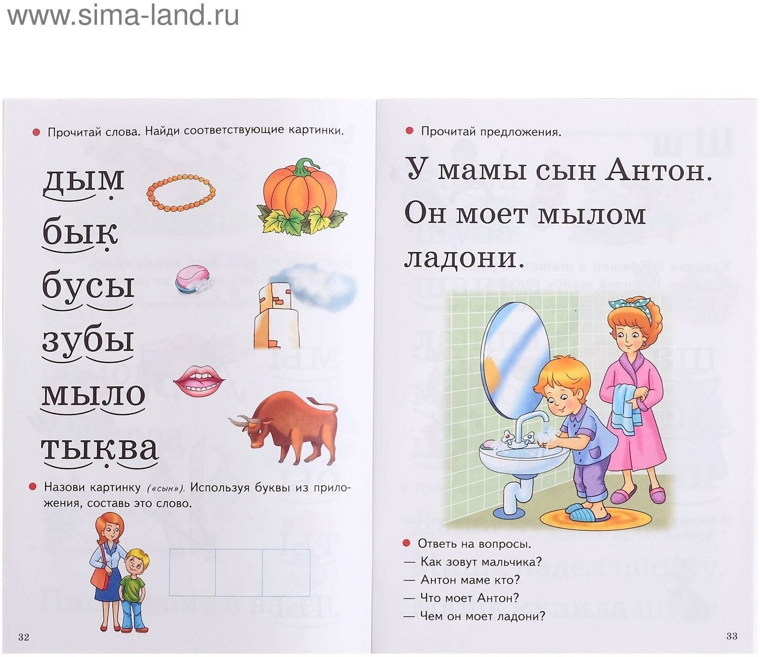 Хорошая толстая книга для начального чтения с ребёнком. 80 страниц. Задания однотипные на каждую букву: прочитай слоги, найди слово, которое начинается на этот слог, назови картинку, напиши это слово, прочитай слово, подбери соответствующую картинку, прочитай предложения, ответь на вопросы. Задания усложняются постепенно. В конце книги появляются уже целые тексты. Очень понравился крупный шрифт. Все рисунки четкие и яркие, не мультяшные, а настоящие. Минус - бумажная обложка, не совсем плотные страницы.