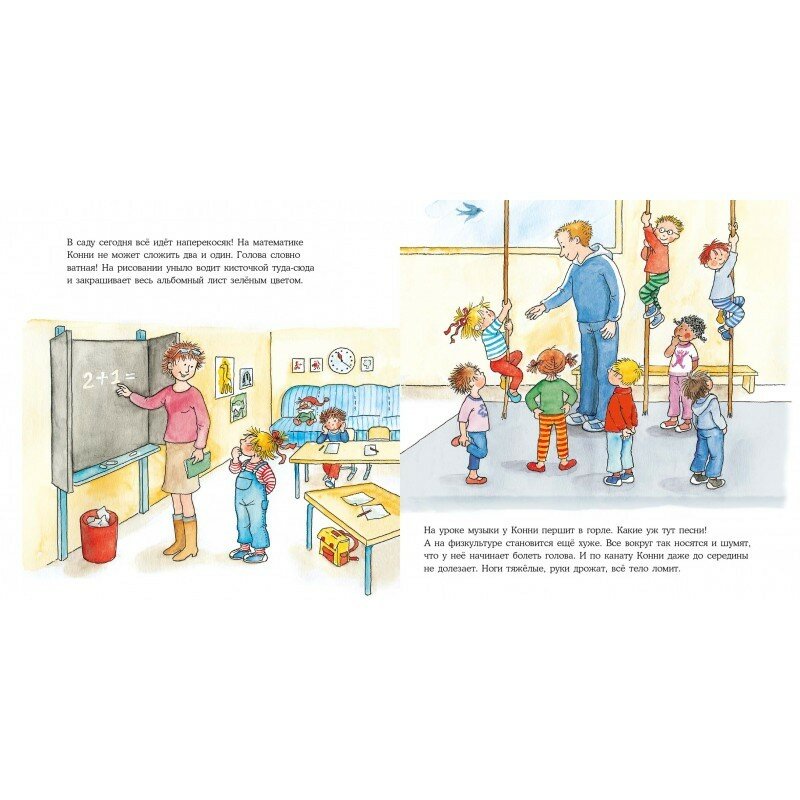 Именно здесь Конни заболевает. Ребёнок учится понимать свое самочувствие, описывать его взрослым, ему не страшно пить лекарство и т.п.
