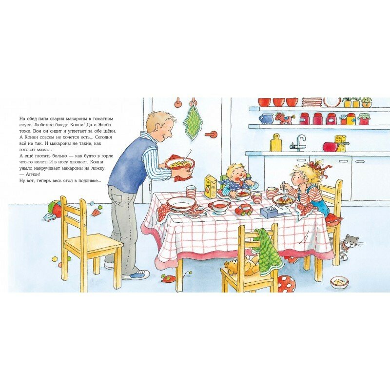 Даже самый крепкий и здоровый малыш время от времени болеет. Вот и у Конни мама уехала в командировку, дома с Конни и Якобом остался один папа, а Конни как назло разболелась. Горло саднит, нос заложен и даже поднялась температура. Справится ли папа без мамы? Конечно! Даже соблюдать постельный режим и пить все лекарства, которые выпишет доктор, с ним будет совсем не скучно. И к возвращению мамы у них все будет хорошо.