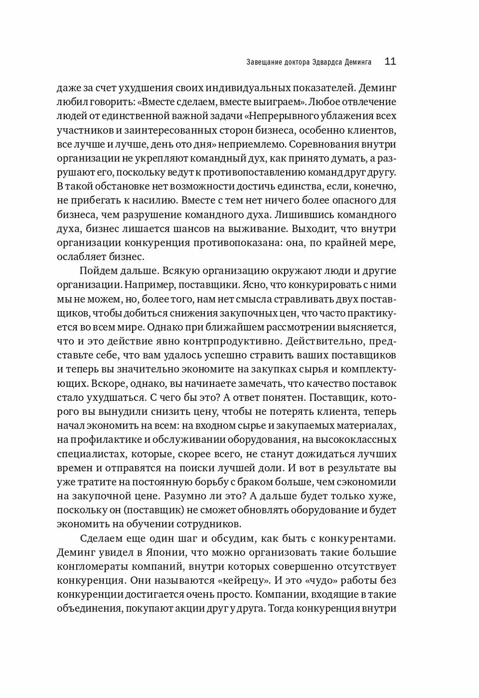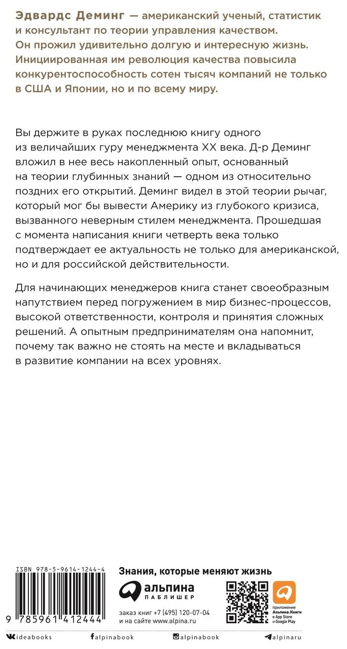 Это последняя книга одного из величайших гуру менеджмента XX века. Д-р Деминг вложил в нее весь свой опыт, основанный на теории глубинных знаний — одном из относительно поздних его открытий. Деминг видел в этой теории рычаг, который мог бы вывести Америку из глубокого кризиса, вызванного неверным стилем менеджмента. Спустя 25 лет с момента написания книги она все еще актуальна, причем не только для американской, но и для российской действительности.
