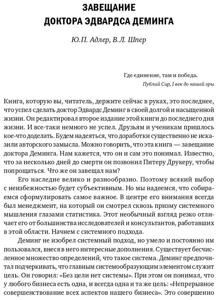 В оригинале книга называется "новая экономика", немного смысл меняется. Это последний труд Деминга, многое что хотел внести, автор не успел, уже заканчивали его ученики. Деминга можно ставить в один ряд с Друкером, настолько велик был вклад в эпоху нового расцвета менеджмента.