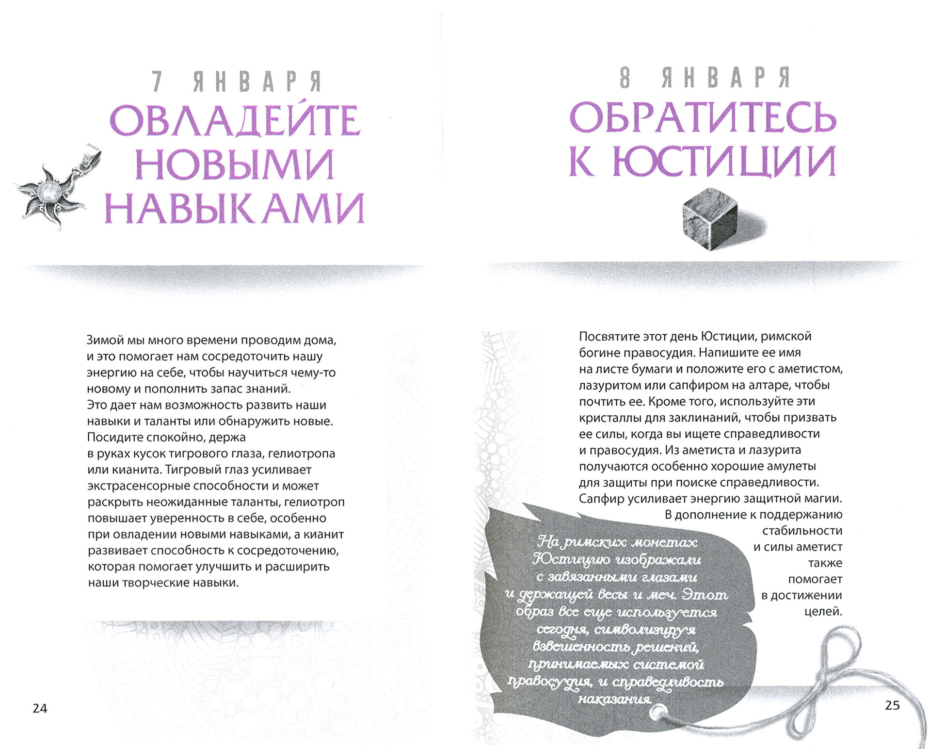 Книга интересна тем, что расписана по дням, то есть на каждый день года даны рекомендации по использованию камней в ритуалах, как подготовить и зарядить кристалл, какой формы могут быть кристаллы. Даны рекомендации по выбору кристаллов для знаков зодиака, показана связь кельтского огама, рун и камней.