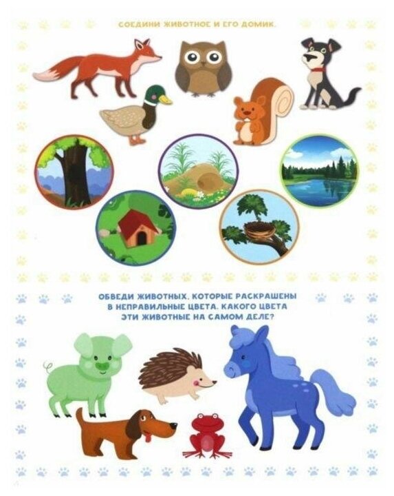 По формату довольно большое (немного больше А4) пособие, сложенное в книгу. Подойдёт для первых занятий с детьми и изучением животных, хотя даже самые маленькие уже знакомы с самыми простыми животными. В книге изображены дикие и домашние животные, есть несколько забавных заданий (к примеру, подобрать тень к животному). В целом, неплохое пособие, плотный картон, на пару занятий за такую цену сойдёт.