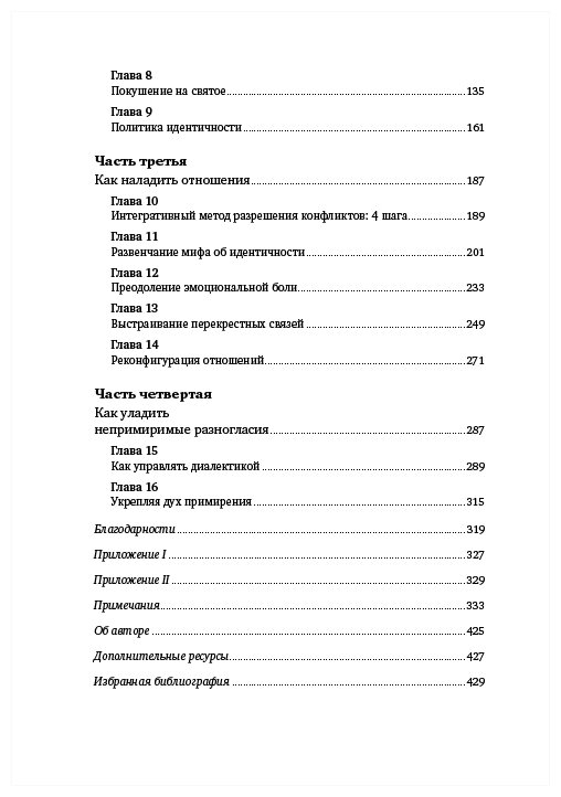 Книга понравилась своей полезностью и ясностью изложения. Автор рассказывает об интегративном методе разрешения конфликтов. Очень много и понятно излагается об идентичности человека. Метод основывается на понятиях - эффект клана и идентичность. Сама книга маленькая, но толстая, 1/4 занимает приложение, в нём сноски для каждой главы. Почитать их перед прочтением главы будет полезно. Много примеров из опыта автора. Логично подаётся совсем не простая информация. Такие книги не на один раз. Можно назвать её руководством по разрешению конфликтов.