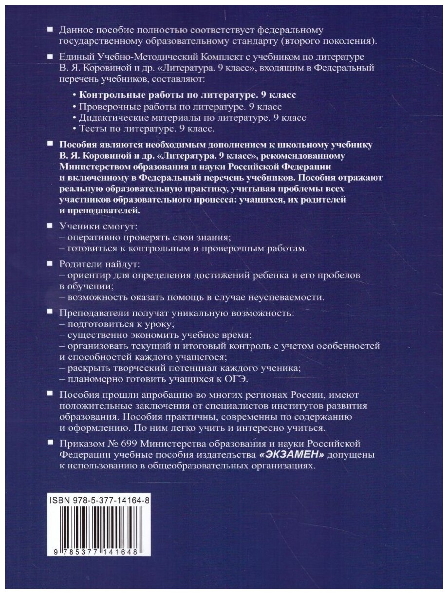 Данное пособие полностью соответствует федеральному государственному образовательному стандарту (второго поколения). .Пособие содержит контрольные работы для итогового контроля знаний учащихся. .Издание предназначено для проверки теоретических знаний учащихся и может быть использовано как на уроках, так и во время самостоятельной работы..Пособие разделено на разделы в строгом соответствии с разделами учебника. .Книга предназначена учащимся и учителям, работающим по учебнику В. Я. Коровиной и др. "Литература. 9 класс", имеющему гриф Министерства образования и науки РФ и входящему в Федеральный перечень учебников, однако сборник может быть использован и при работе по другим учебникам, так как учитывает требования федерального государственного образовательного стандарта..