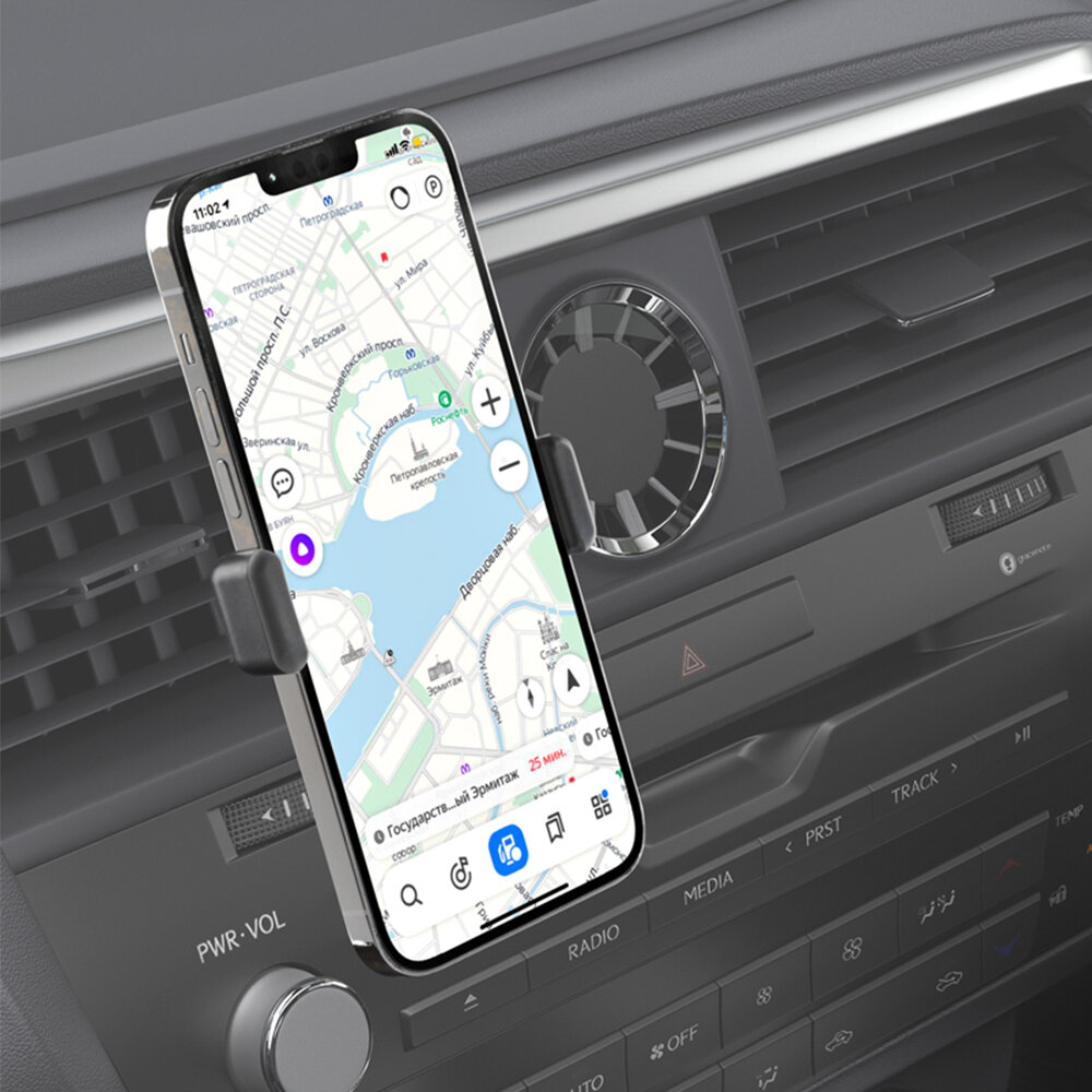 Крепится на вентиляционную решетку в салоне автомобиля. Такой монтаж позволяет установить мобильное устройство в удобном месте и сохранить обзор через лобовое стекло. Площадка держателя дополнена раздвижными фиксирующими элементами, которые делают этот аксессуар универсальным решением для использования с разными моделями мобильных устройств.