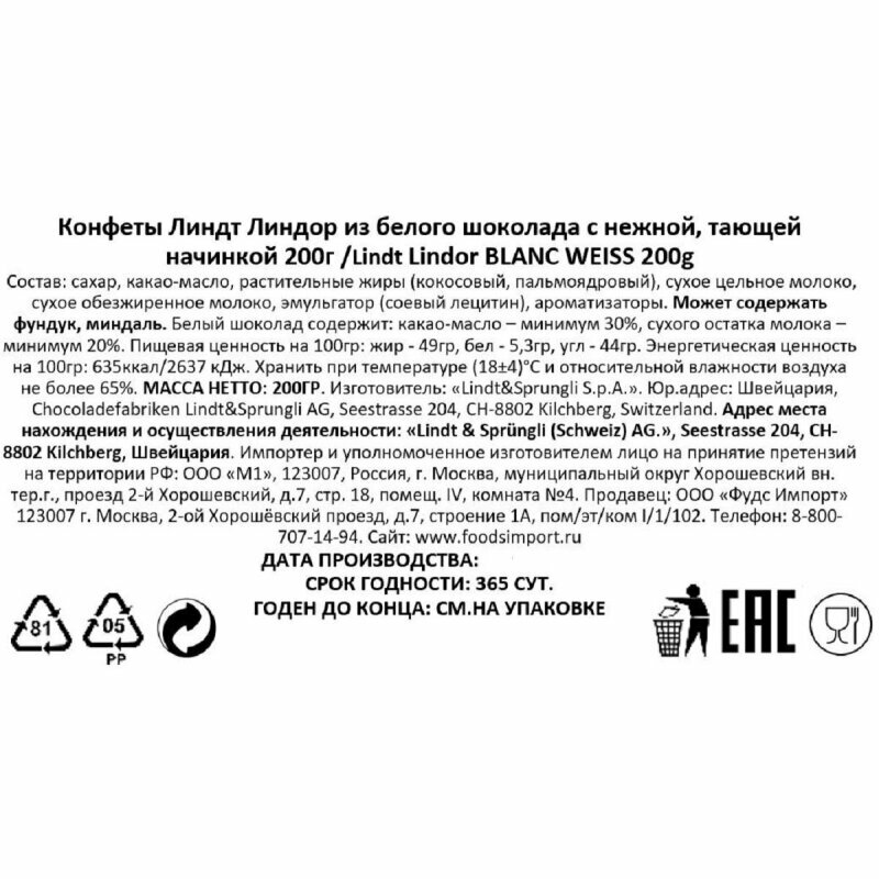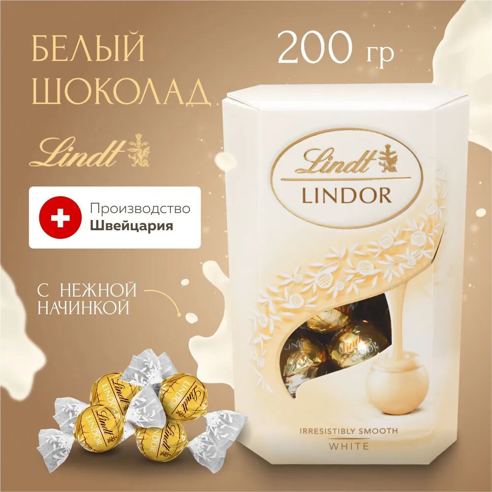 Конфеты шоколадные Lindt Lindor Линдт Линдор Белый корнет 200 грамм в подарочной упаковке.Конфеты Lindt Линдт из белого шоколада. Побалуйте себя восхитительными шоколадными пралине Lindor Линдор Milk, приготовленными из восхитительного белого шоколада Линдт Lindt с неотразимо мягкой начинкой. Правильная вещь, когда вы хотите уделить время себе, насладиться моментами с друзьями или подарить своим близким. Эти пралине от лучших шоколатье Lindt станут прекрасным подарком для любого любителя шоколада, в том числе и для вас самих!В составе используется шоколад премиум-качества. Страна Италия.