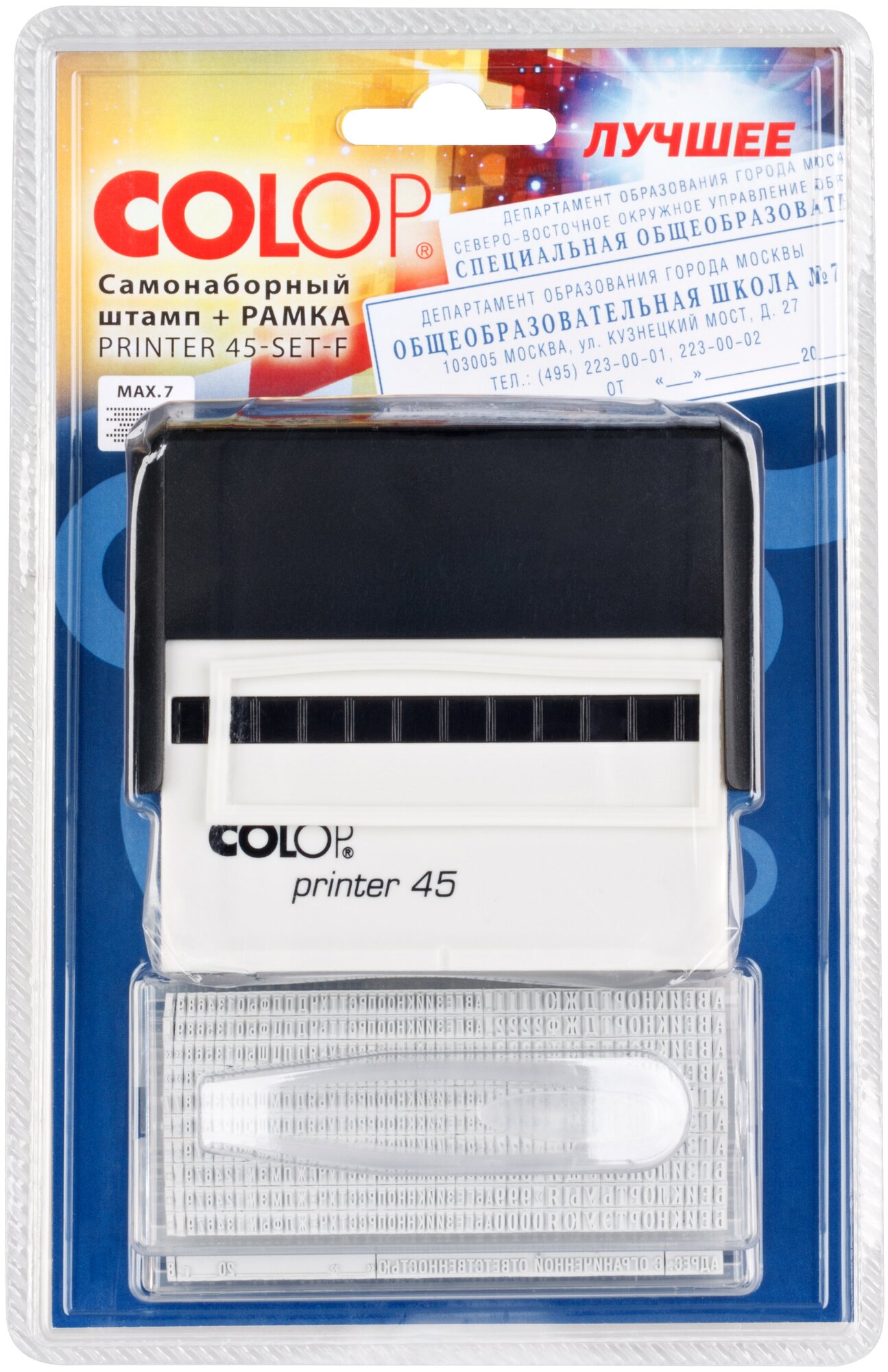 На сегодняшний день товар «Самонаборный штамп автоматический COLOP оттиск 82 х 25 мм шрифт 3.1 мм прямоугольный PRINTER C45 SET-F» можно купить с кешбеком в 1 магазине: Яндекс.Маркет