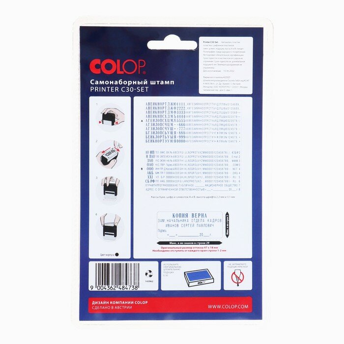 | Комплект поставки | штамп с рифленой пластиной для набора текста, касса букв и символов, пинцет, синяя сменная подушка. |