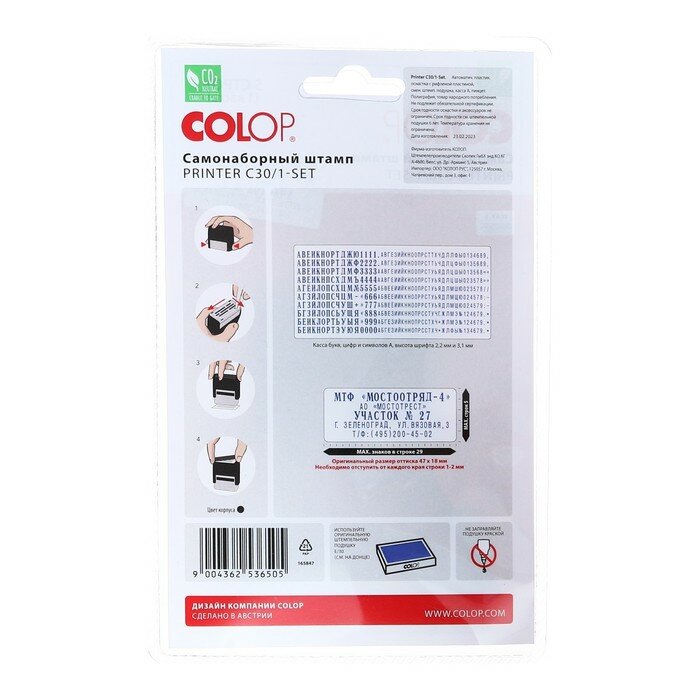 | Описание | Штамп самонаборный Colop Printer C30-Set используется для самостоятельного создания и оперативного изменения текста оттиска. Компактный и надежный пластиковый корпус с автоматическим окрашиванием. Прозрачное основание и метка, указывающая на середину, позволяют точно размещать оттиски на документах. Штемпельная подушка легко заменяется. Оптимальный набор букв, цифр и символов с креплением на одной ножке, экспресс-набор текста. Размер поля — 47?18 мм, 5 строк. Максимальное количество знаков в каждой строке — 29 основным шрифтом или 22 большим шрифтом. Комплектация:штамп с рифленой пластиной для набора, две кассы букв — Type Set A и Type Set B, синяя сменная штемпельная подушка E/30, пинцет.,,Внимание! При использовании для набора текста широких символов (Ж, М, Ф, Ш, Щ, Ю, Ы), цифр, пробелы, а также при комбинации шрифтов 2,2 мм и 3,1 мм, данные по максимальной вместимости символов будут снижаться. Так же символы требуется размещать с отступом от края (внутрь). При размещении символов на самом краю не будет отпечатываться середина оттиска. |