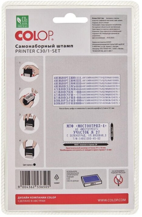 | Комплект поставки | штамп, синяя сменная штемпельная подушка E/20 |