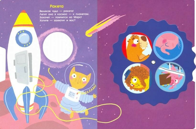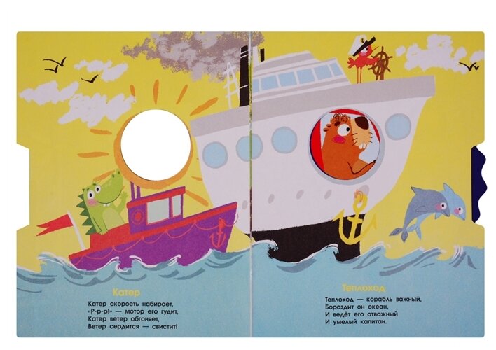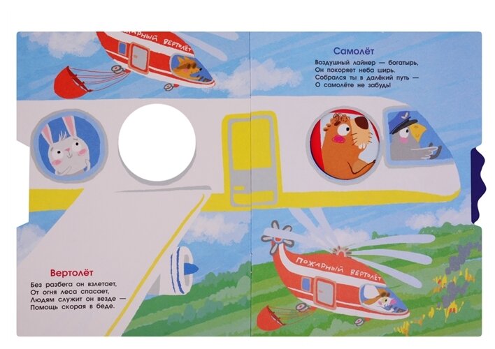 Вся книжка состоит из шести страничек, обычная плотная бумага. Что очень расстроило меня, так как ожидала, что будет картон. На каждой страничке четверостишье про один вид транспорта. На колесике четыре различных животных. Своих денег книжка я думаю не стоит.