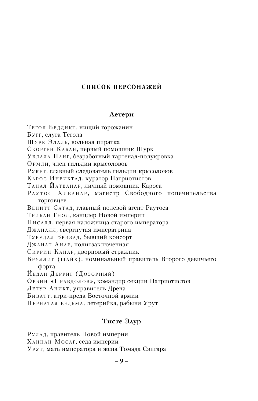 Неспокойно в Летерийской империи. Рулад Сэнгар, Император Тысячи Смертей, попал под демоническую власть своего колдовского меча, который дарит ему бессмертие. Тайная полиция Патриотистов начинает чистки среди подданных. Пророки больше не могут видеть грядущее. Дворец полон заговорщиков, чиновники коррумпированы и ими движут только личные интересы. Старая Империя на грани войны с окружающими королевствами, которые не забыли давние обиды.
