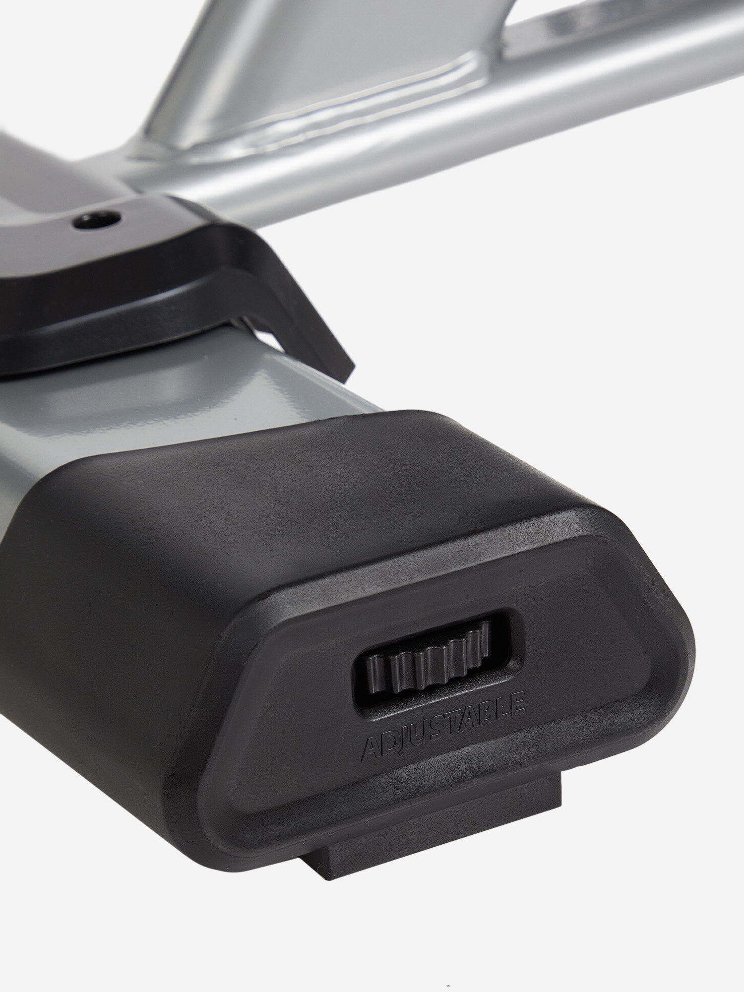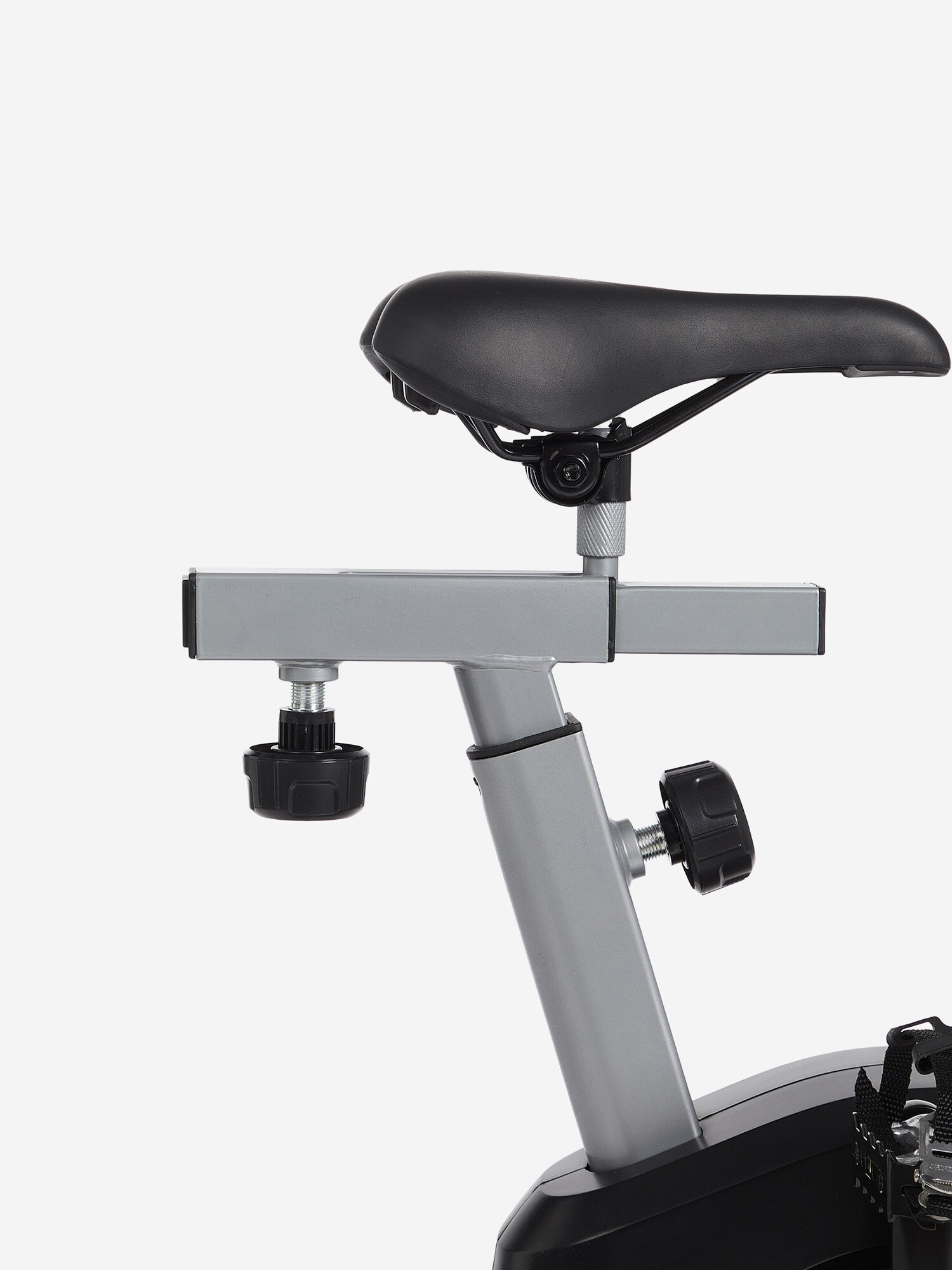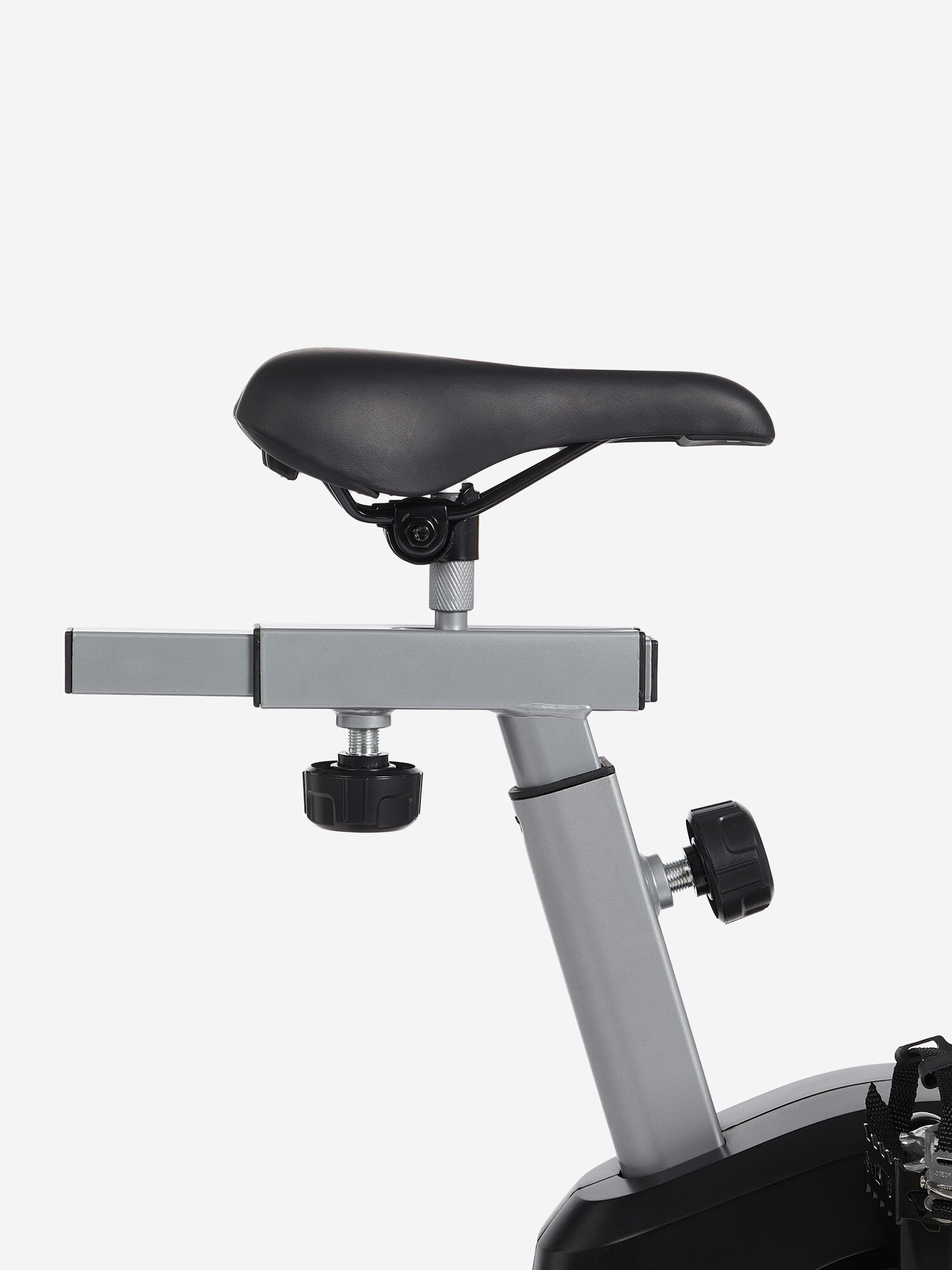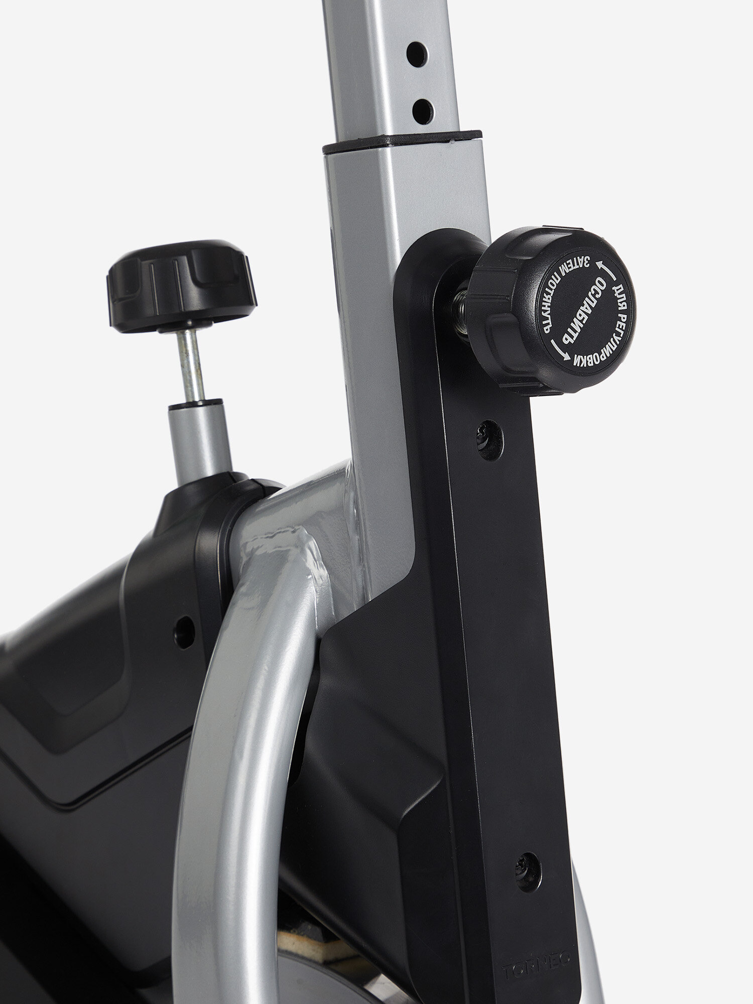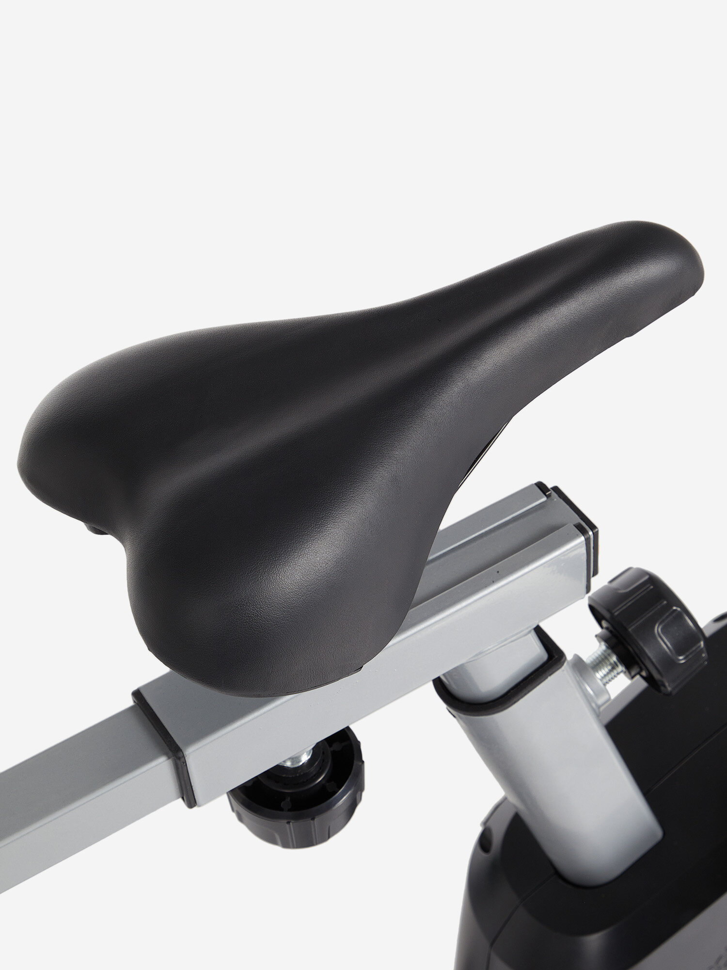Анатомическое седло, регулируемое в трех плоскостях, многопозиционный руль, регулируемый по вертикали и горизонтали, а также педали с туклипсами и регулируемыми ремешками.