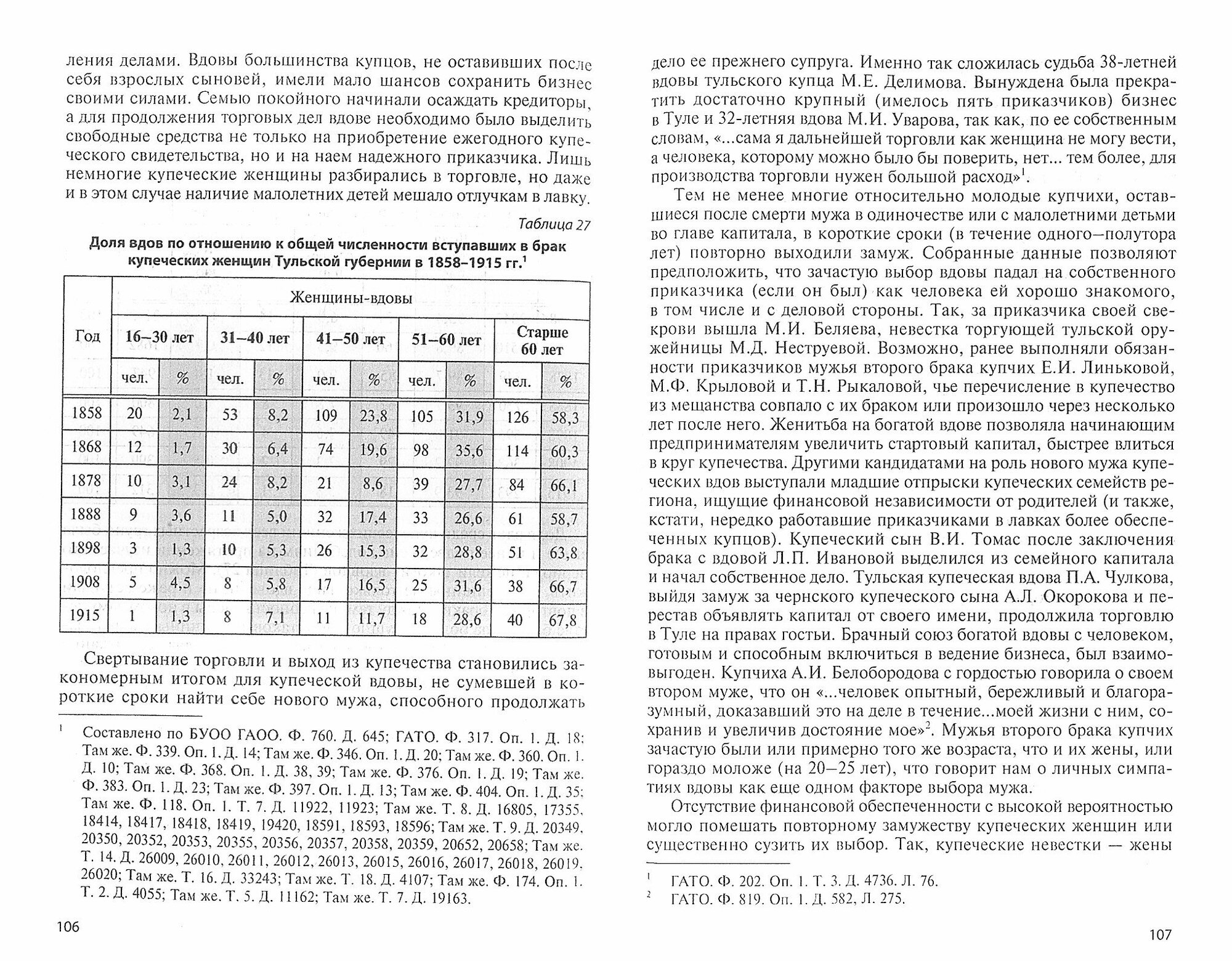 Монография посвящена исследованию процессов эволюции повседневной жизни купечества - элитной группы в составе городского сословия дореволюционной России - в период капиталистической модернизации страны. На примере купечества Тульской губернии рассмотрены следующие аспекты: состав группы, организация предпринимательской деятельности, численность семьи, браки и мезальянсы, внутрисемейные конфликты, образование и воспитание детей, а также особенности домов, интерьеров, форм досуга и внешнего облика представителей купечества второй половины XIX - начала XX в. Работа основана на широком круге разнообразных источников, как опубликованных (законодательные документы, литературные памятники, источники личного происхождения, фотодокументы), так и неопубликованных (материалы Государственного архива Тульской области (ГАТО) и Государственного архива Орловской области (БУОО ГАОО)).