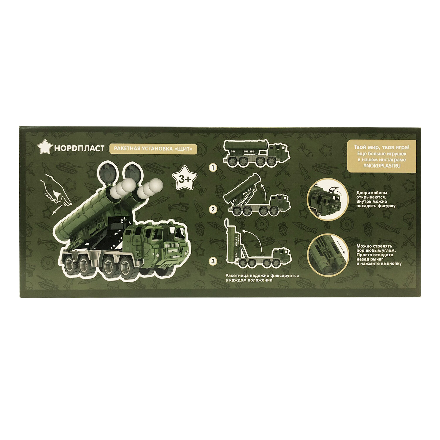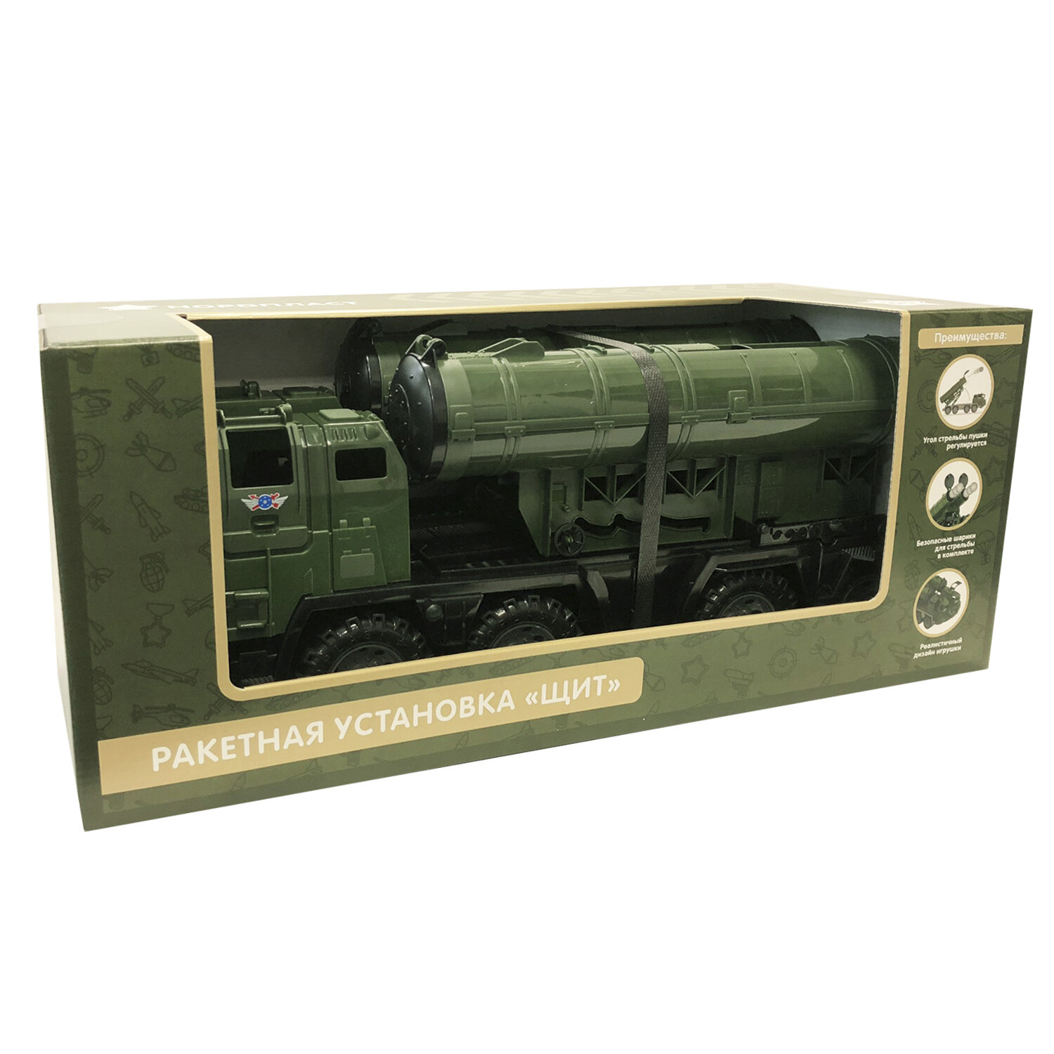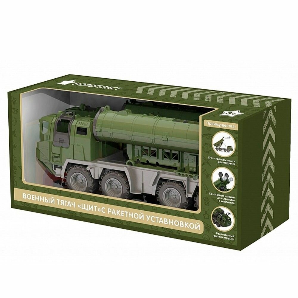 Представляем Вам серию игрушек — военные тягачи «Щит». Ракетная установка «Щит»: Тягач оснащен подъемным фиксирующимся механизмом ракетной установки. Две ракетницы стреляют как по отдельности, так и одновременно с помощью спусковых крючков. В качестве снарядов для стрельбы подойдут шарики для настольного тенниса. Два таких шарика входят в комплект установки. Защитные люки, закрывающие стволы ракетниц, обеспечат удобную транспортировку машины ребенком. Каждый тягач оснащен двумя кабинами, на открывающихся дверцах методом тампопечати нанесен рисунок, тягачи на четырех колесных парах на металлических осях прекрасно подходят для перевозки игрушек.