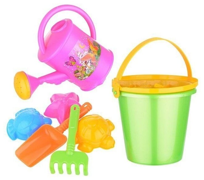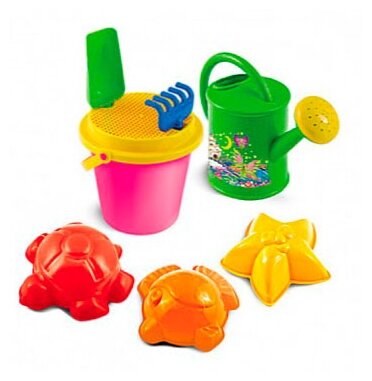 - Комплектация: 3 формочки "Морские", лейка, ведро Нордпласт, сито, грабли, совок