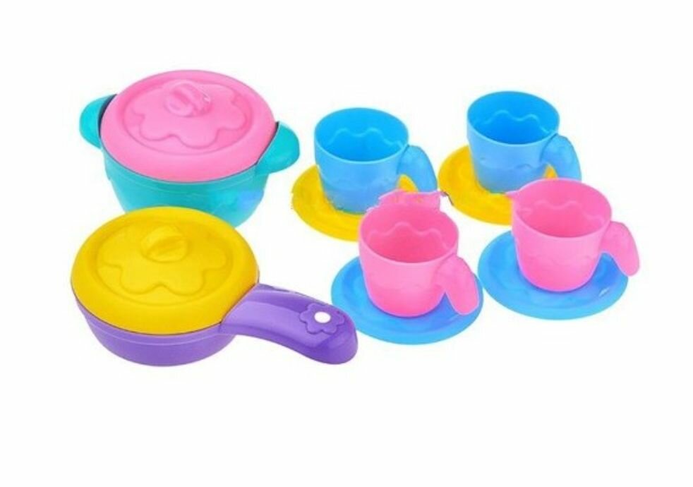 Ваша малышка уже представляет себя маленькой хозяюшкой и готовит для своих кукол обеды и завтраки? Тогда ей обязательно пригодится такой сервиз, с помощью которого она сможет совершенствовать свои кулинарные таланты! Поверхность посуды украшена рельефным узором. Комплект состоит из 12 предметов и способствуют развитию фантазии, мелкой моторики рук, познанию начальных азов этикета, сервировки стола и приема гостей и просто веселому времяпрепровождению.