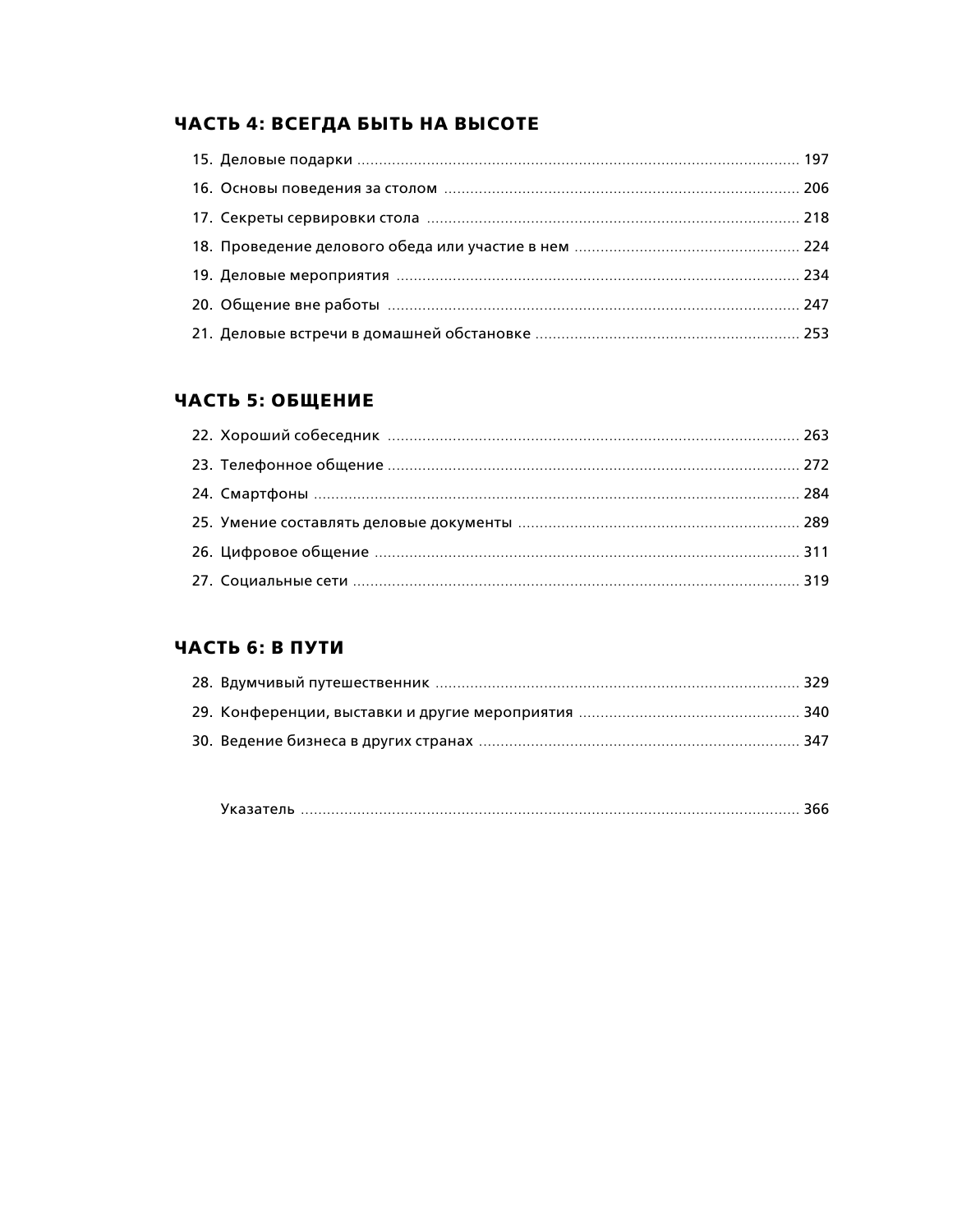 Вы сможете найти ответы и рекомендации буквально по всем вопросам, которые касаются деловой жизни человека начиная от внешнего вида, умения организовывать встречи, и заканчивая вечерними официальными мероприятиями.