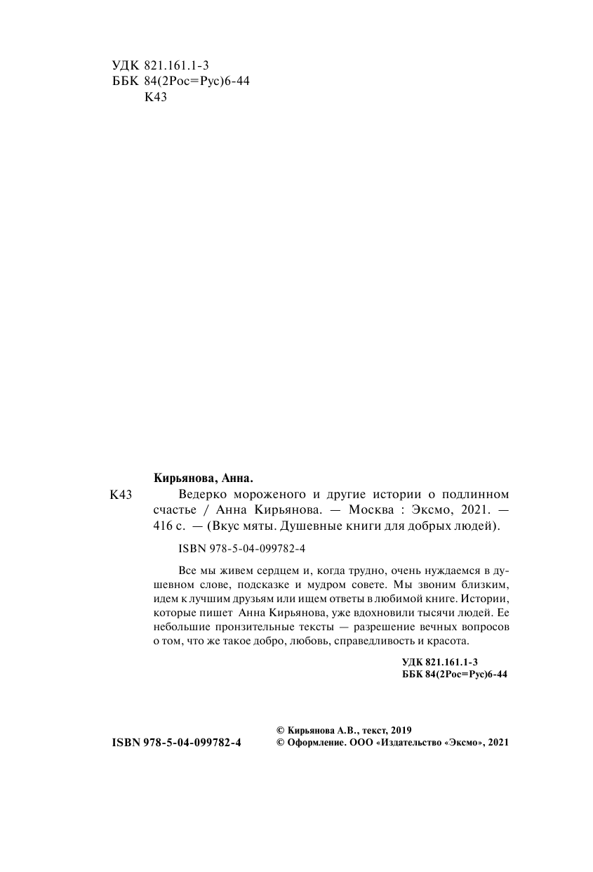 Иногда, чтобы сделать свой день чуточку лучше, достаточно просто купить ведерко мороженого. Все мы живем сердцем и, когда трудно, очень нуждаемся в душевном слове, подсказке и мудром совете. Мы звоним близким, идем к лучшим друзьям или ищем ответы в любимой книге. Истории, которые пишет Анна Кирьянова, уже вдохновили тысячи людей. Ее небольшие пронзительные тексты - разрешение вечных вопросов о том, что же такое добро, любовь, справедливость и красота.