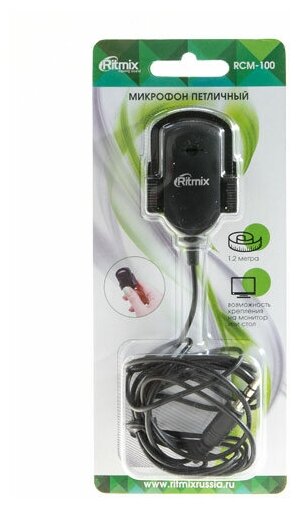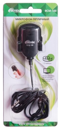 Ritmix - легкий петличный микрофон, который можно также использовать в качестве компьютерного - прилагается крепление на монитор. Данную модель можно прикрепить к одежде с помощью удобной и надежной прищепки, которая находится на его корпусе.