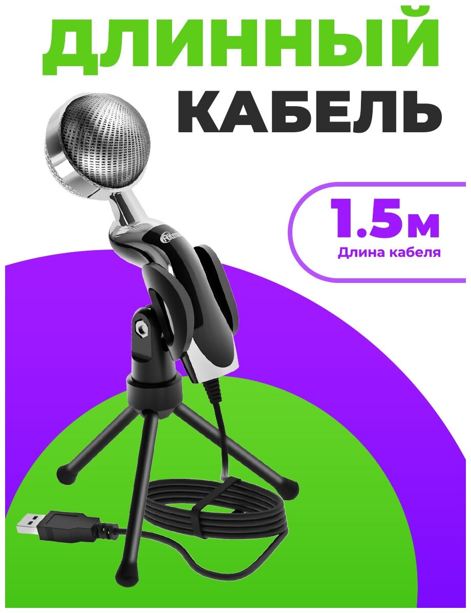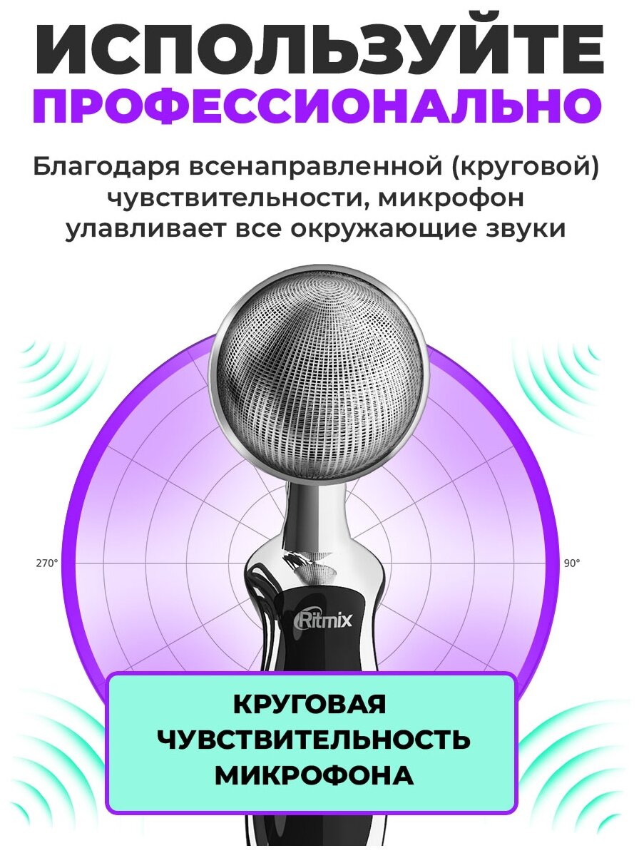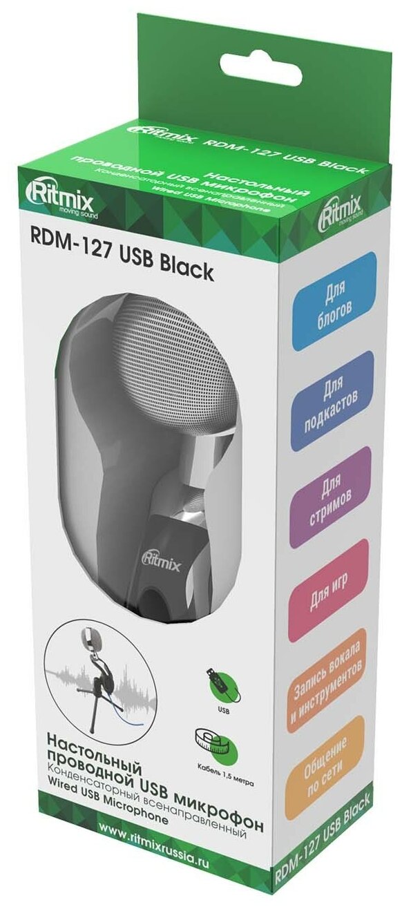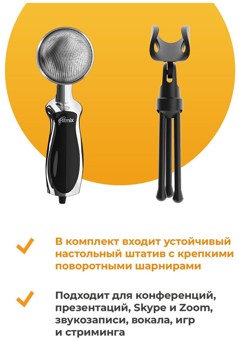 Конденсаторный микрофон Ritmix USB на штативе-подставке, позволяющей комфортно расположить его на рабочем столе или другом удобном для вас месте. Предназначен для деятельности в таких сферах как: интервью, презентации, skype, звукозапись, игры, стриминг.