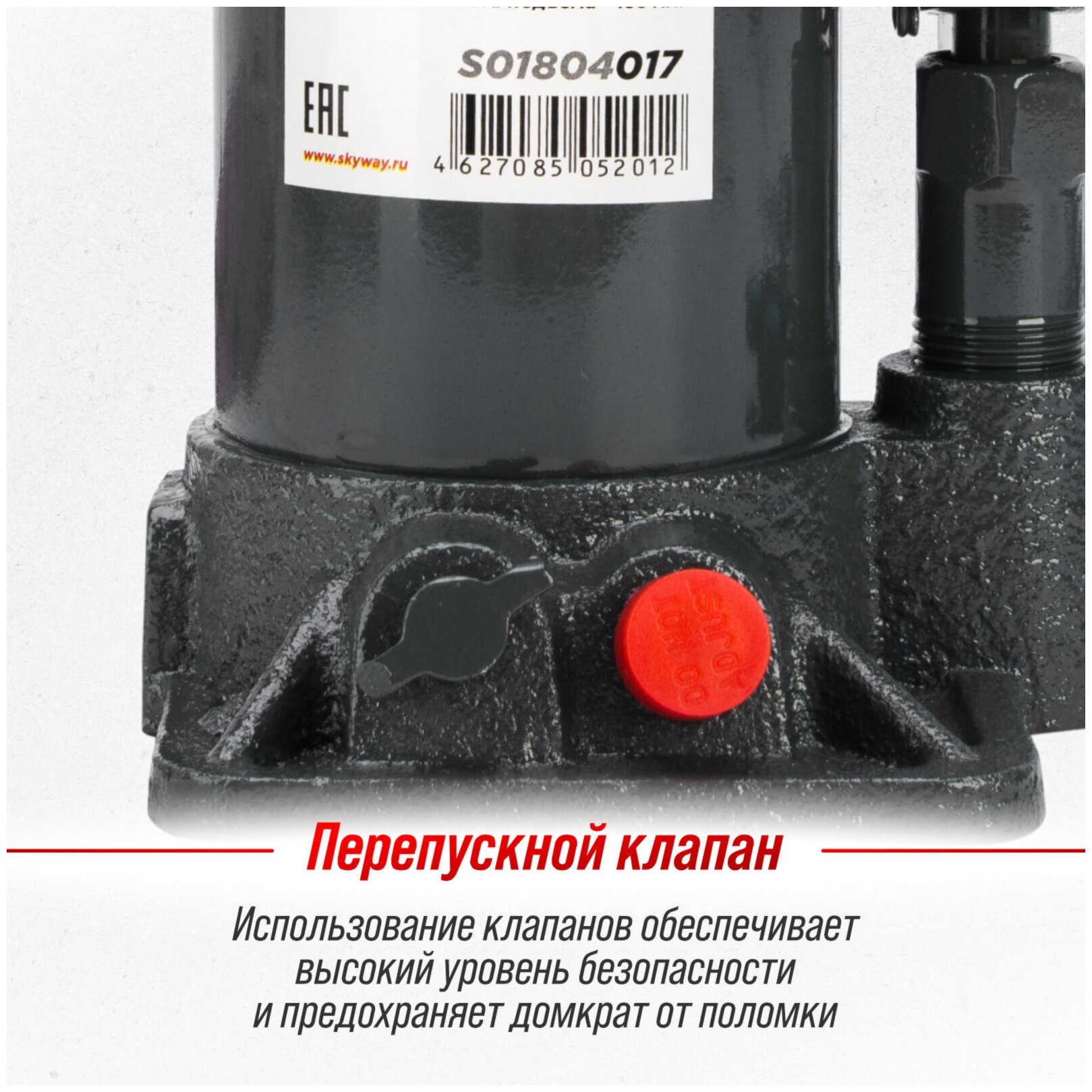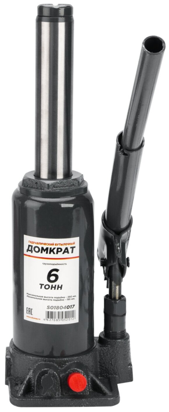 Домкрат гидравлический бутылочный 6т h 195-380мм SKYWAY с клапаном в коробке+сумка-полностью металлическая конструкция узлов и агрегатов обеспечивает высокую надежность и отказоустойчивость. Перепускной клапан предохраняет домкрат от поломки, если вес груза превышает грузоподъемность домкрата.