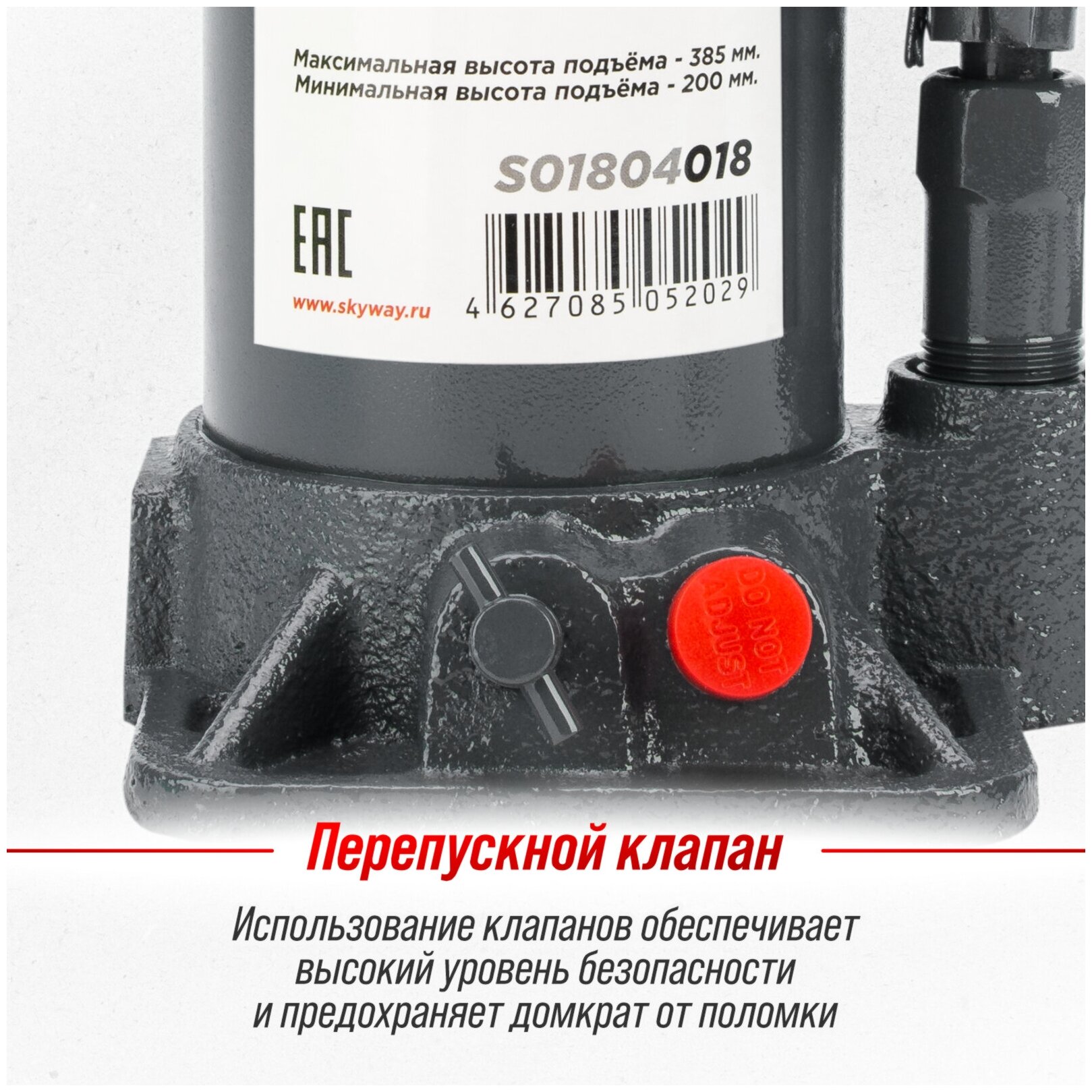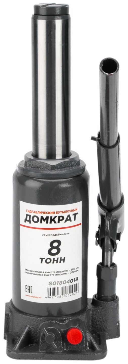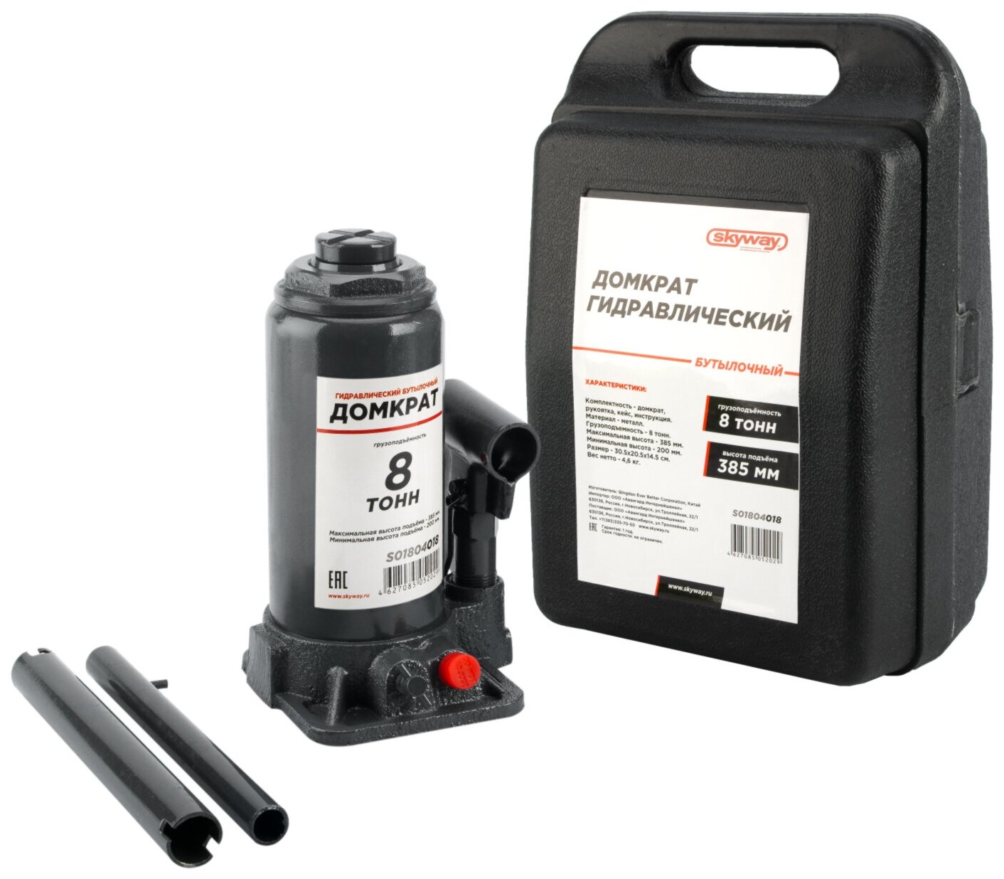 Домкрат гидравлический бутылочный 8т h 200-385мм SKYWAY с клапаном в кейсе-специальный механизм, предназначен для подъема тяжелого груза и фиксации его на требуемой высоте. Гидравлические домкраты являются наиболее эффективными, рабочее усилие создается при помощи гидравлического масла и поршня.Порядок работы.Подъем:Узким концом рукоятки домкрата следует закрыть выпускной клапан, повернув его до упора по часовой стрелке.Установите домкрат в подходящем месте под грузом или транспортным средством (см. Инструкцию по эксплуатации транспортного средства). В случае необходимости выворачивайте удлинительный винт домкрата против часовой стрелки до соприкосновения с грузом.Вставьте рукоятку в разъем домкрата и качайте до поднятия груза на необходимую высоту.Опускание:Узким концом рукоятки домкрата следует медленно открывать выпускной клапан, поворачивая против часовой стрелки.Скорость опускания зависит от скорости открытия выпускного клапана. Не открывайте выпускной клапан более, чем на один полный оборот.После полного опускания груза, верните удлинительный винт на место, вращая его по часовой стрелке, и сложите домкрат в сумку.Грузоподъемность: 8тонны.