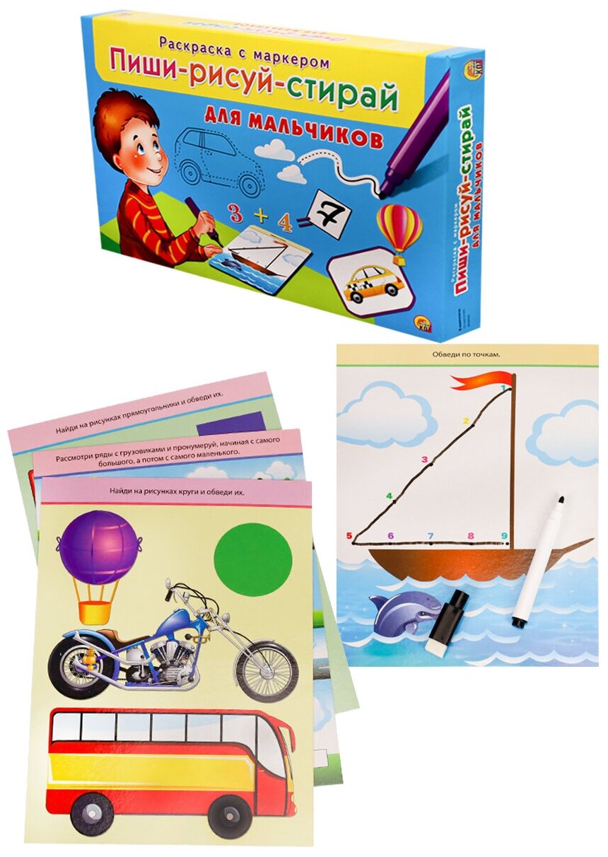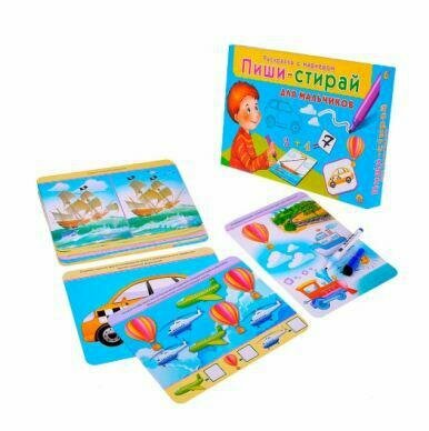 Развивающий набор для мальчиков из серии Пиши-стирай от компании Рыжий кот представляет собой настольную игру. Она состоит из 16 карточек для раскрашивания и черного маркера. Каждая карточка содержит интересное задание. Выполнив его, можно вставить листок в рамку и повесить на стенку как красивую картинку. Все детали набора изготовлены из плотного качественного картона и пластика.